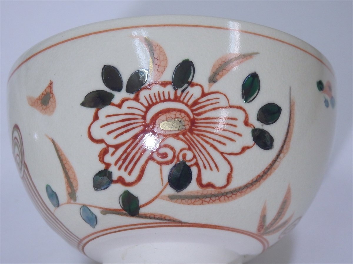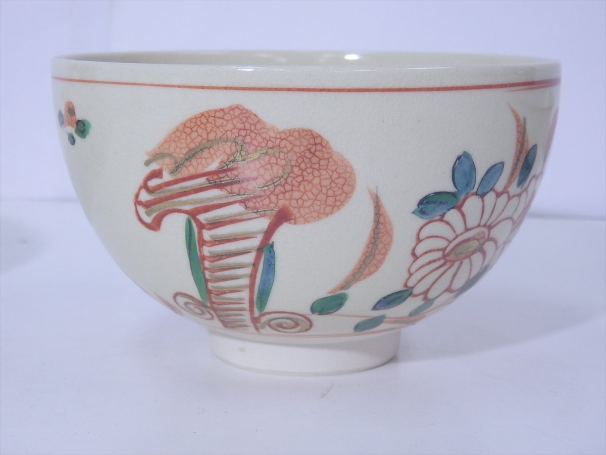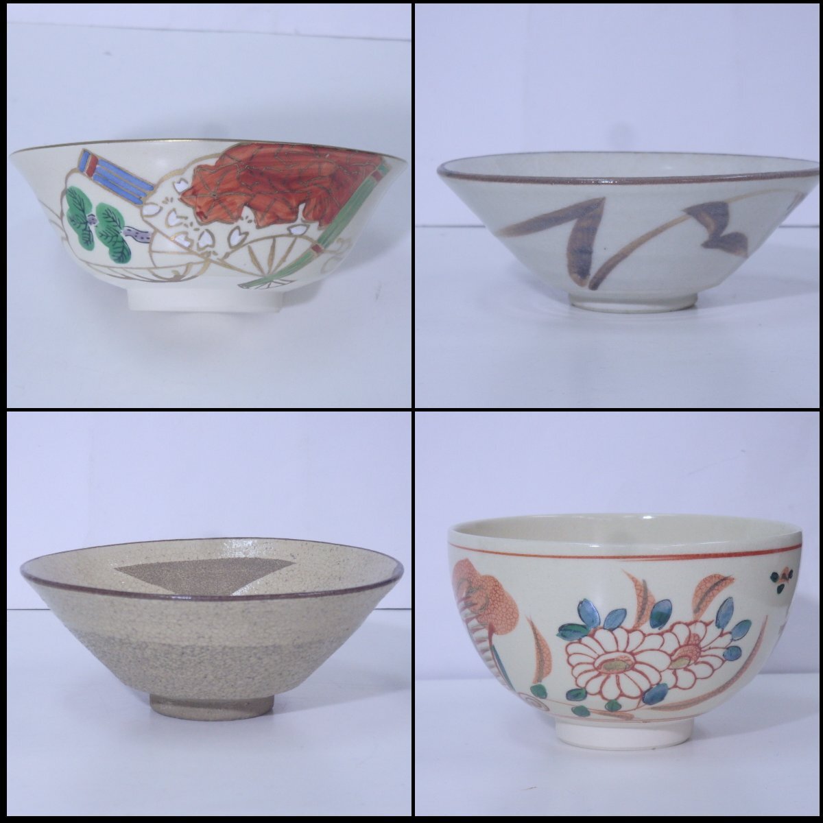 【管理番号5-0326286-6 スタッフコメント:iy】  ☆赤絵の茶碗(昌山/銘)と、志野の平茶碗が新陶と古陶の2種、扇面の夏茶碗(隆山)の4点セットです。割れや欠けのない状態の良いものをセットにしています。お買い得です!
