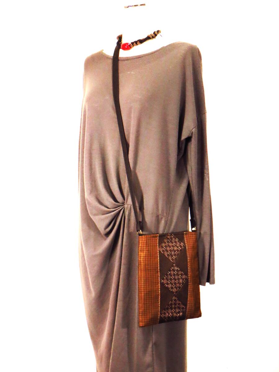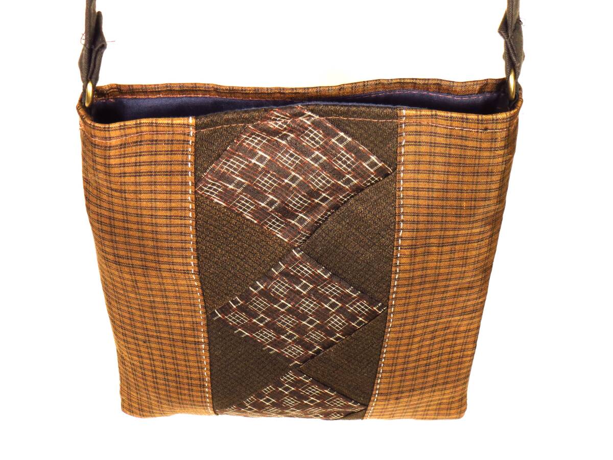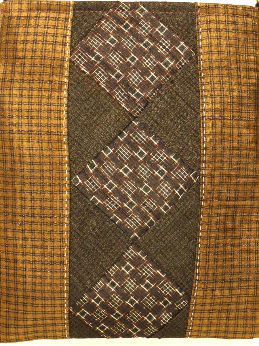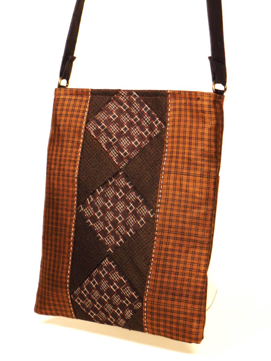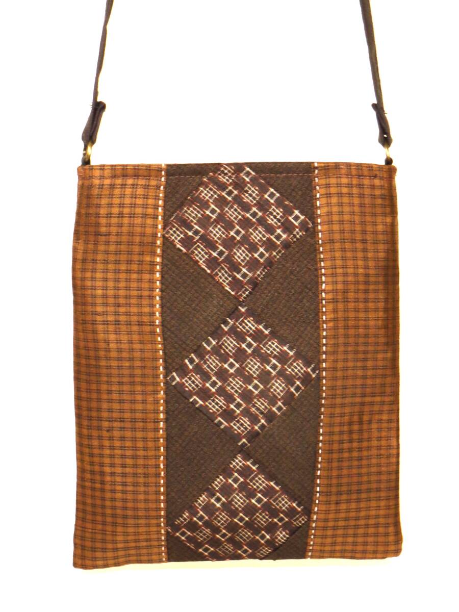 こげ茶色のチェック着物地に大島柄の菱形を縦にパッチした、お散歩ポシェット。縦に刺し子のラインを入れました。