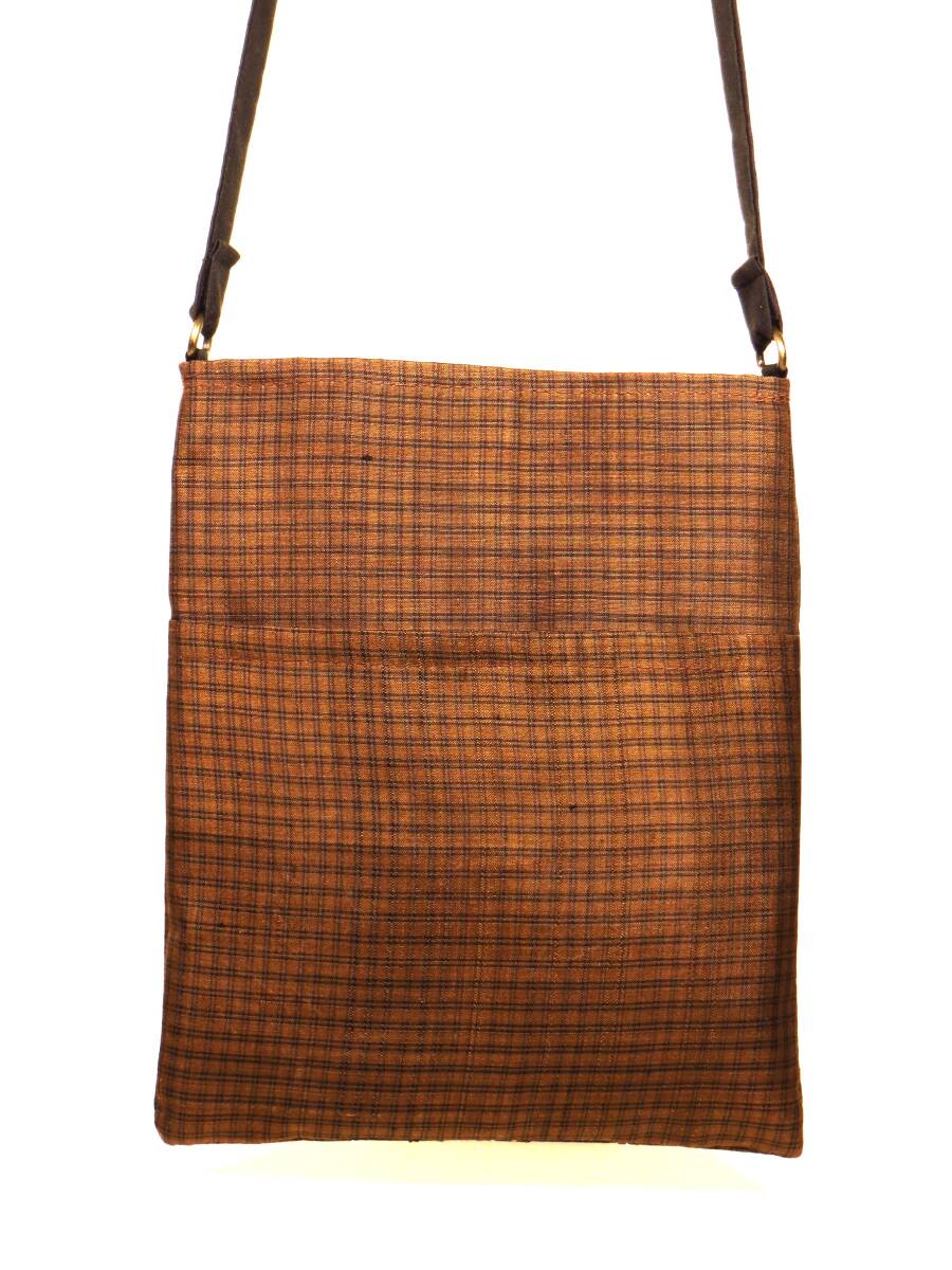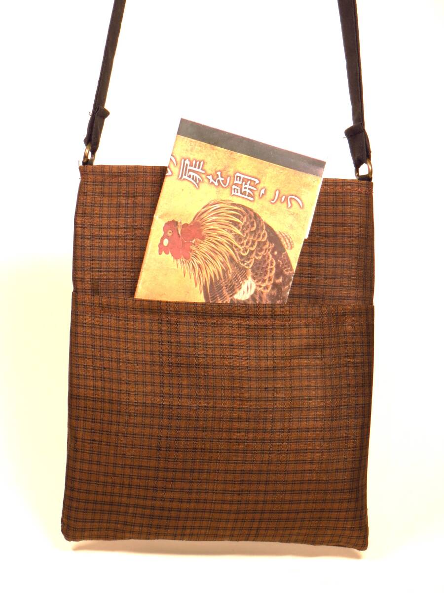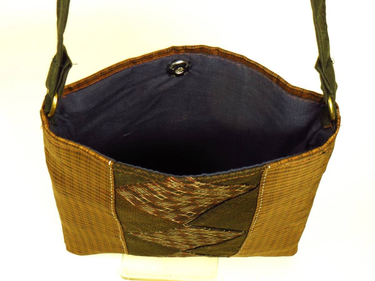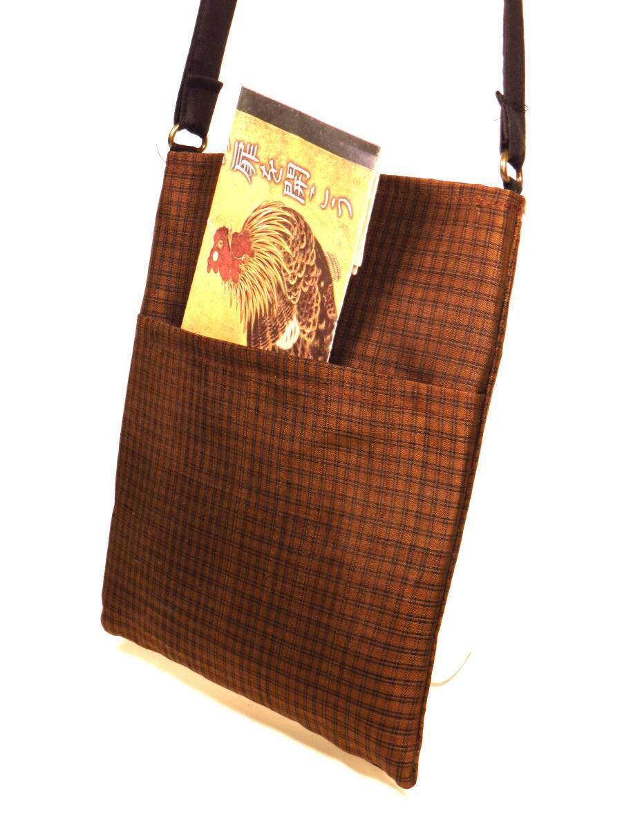 ◆手作り こげ茶色のチェック着物地に菱形の大島柄を縦にパッチした、お散歩ポシェット