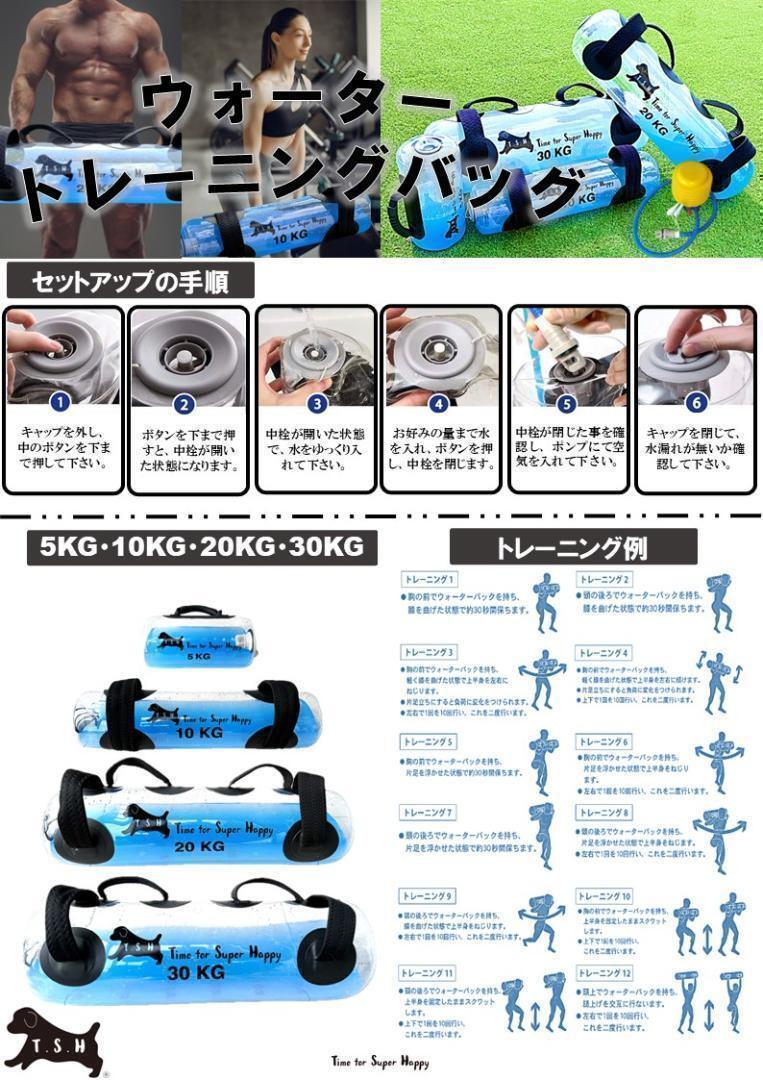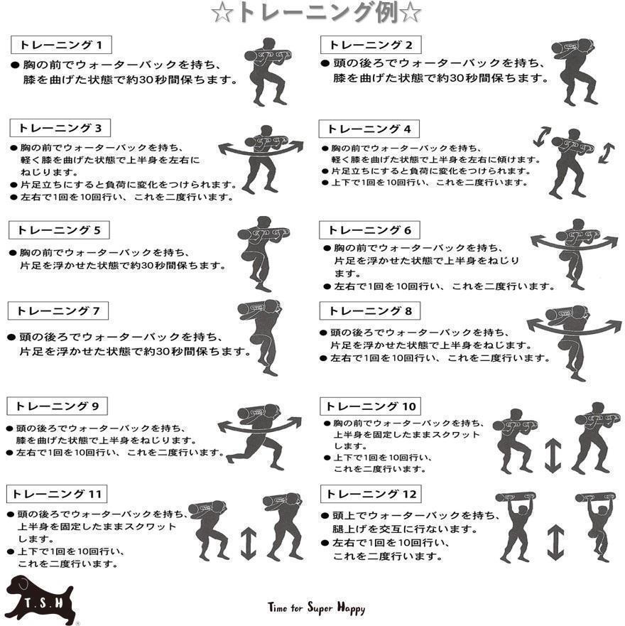 ***ゆうパックなら毎日発送!ゆうパックを指定して頂ければお届けが早いです。沖縄・北海道・匿名配送希望の方はおてがる配送をお選び下さい。*** ☆ 水を使った体幹ウェートトレーニング器具です。 ☆ 最大重量5kg、10kg、20kgと30kgの4サイズが御座います。 【5kg】 長さ約30cm 直径約15cm 【10kg】長さ約61cm 直径約15cm 【20kg】長さ約77cm 直径約18cm 【30kg】長さ約81cm 直径約22cm ☆ メモリに合わせてお好みの量の水を入れ、重量を調整して下さい。その後、専用ポンプにて空気を入れて、しっかりと蓋をして下さい。 ☆ 水の重さを利用したり、水の流れに逆らったりしながら、色々なトレーニング方法で体幹、筋力を鍛える事が出来ます。 ☆ 水の着色料は付いておりません。 ☆ 水と空気を抜いた状態なら軽量コンパクトなので、何処へでも持ち運び簡単です。 ☆ PVC素材を使用しておりますので柔らかく柔軟性は有りますが、低温では固くなる特性が有り、過度なストレスをかけると破損する可能性が御座います。氷点下での保管やご使用には十分にお気をつけ下さい。