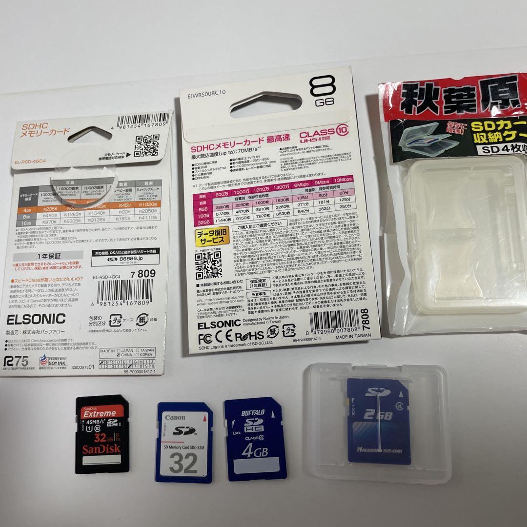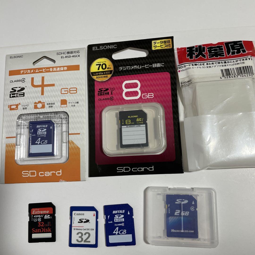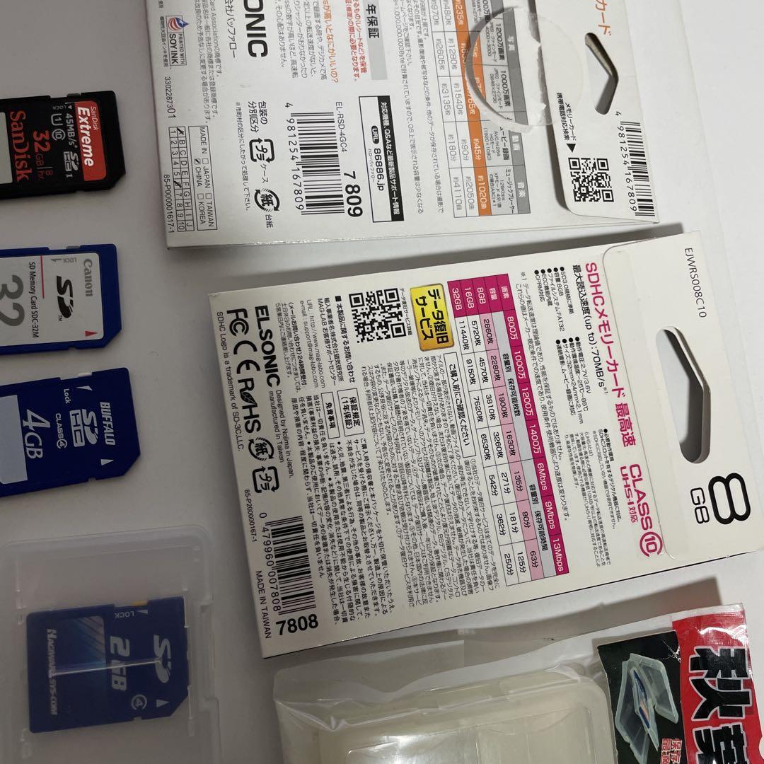 複数のSDカードが含まれ、様々な容量(2GB、4GB、8GB、32GB)とクラス(Class 10)を提供。 - 容量: 8GB class10 ELSONIC 1枚 新品 - 容量: 2GB HAGIWARA sys-com - 容量: 4GB class4 Buffalo 2枚 - 容量: 32GB class10 Canon 1枚 - 容量: 32GB class10 SanDisk 1枚 SDカードクリアケース 4枚収納。