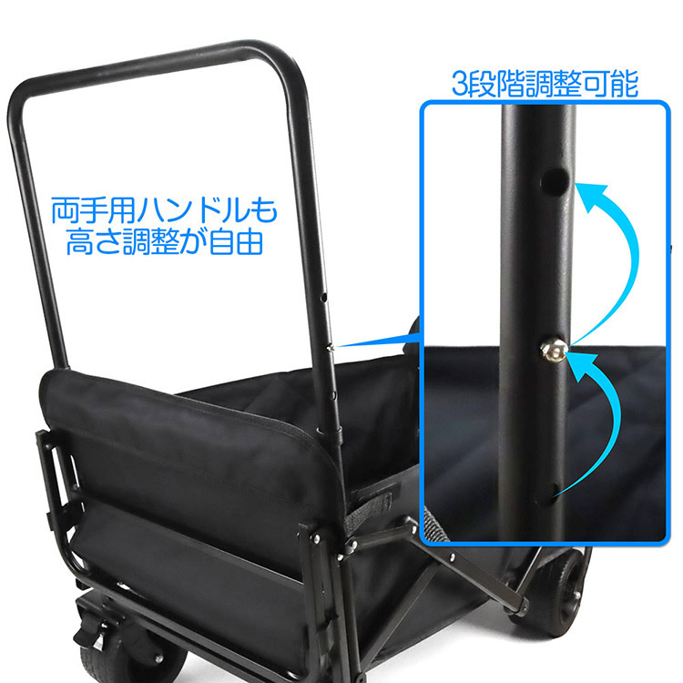 ■番号:H000155YH ■ 収納容量:約230L。 ■ 耐荷重:約200kg。 ■ 本体重量:約15kg。 ■ 展開後サイズ:150×50×100cm。 ■ 折りたたみサイズ:77×58cm。 ■ ハンドル調節:3段階調整。 ■ 商品内容:キャンピングカート 1台。 | |