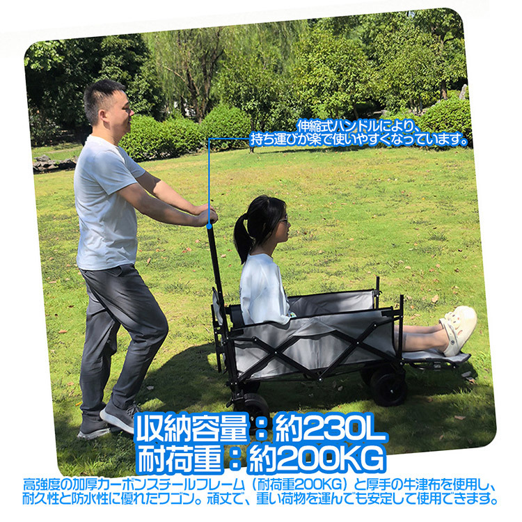 ■ 前後開閉可能で長物対応、最大展開サイズ152×50×100cm。収納時はコンパクトに77×58cmとなり、場所を取らずに保管できます。200Lの大容量でテント、寝袋、炊事用品など様々なアイテムを収納できます。 ■ 伸縮式ハンドルは3段階に調節可能で、身長異なる人々に対応でき、快適に使用できます。伸縮式ハンドルにより、持ち運びが楽で使いやすくなっています。 ■ ダブルフロントブレーキと360°回転キャスター付きの特大タイヤ(幅:約10cm、直径:約17cm)で、斜面、芝生、ビーチ、泥道、凹凸地面にも対応。坂道走行時にもブレーキが効き、荷物が滑りにくく、安全に移動できます。 ■ 高強度の加厚カーボンスチールフレーム(耐荷重200kg)と厚手の牛津布を使用し、耐久性と防水性に優れたワゴン。頑丈で、重い荷物を運んでも安定して使用できます。 ■ 軽量で耐摩耗性に優れたタイヤにより、様々な地形でもスムーズに使用でき、野外活動でも大活躍します。 | |