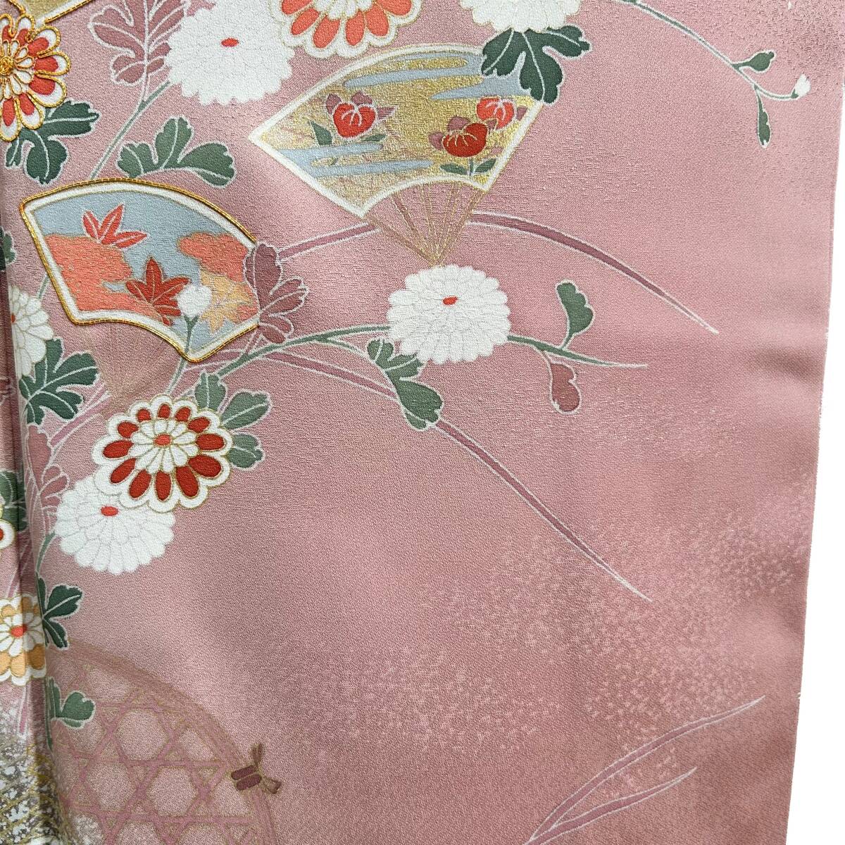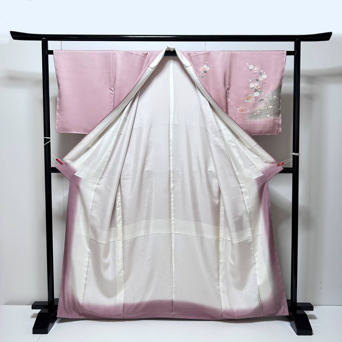 訪問着 着物 フォーマル 正絹 金駒刺繍 金彩加工 花と地紙 中古 仕立て上り 身丈162 裄65 Mサイズ MWR-No.005 26122024 マダム 和装