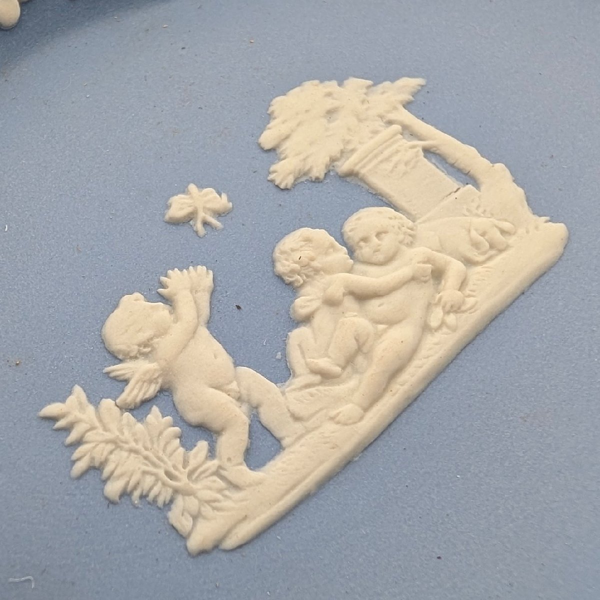 ウェッジウッドを代表するペールブルーと呼ばれる明るい青のカラーで、それぞれにこと元天使をモチーフとしたレリーフが装飾されています。