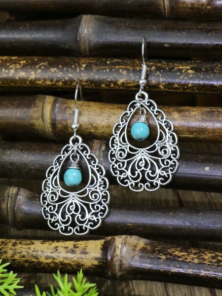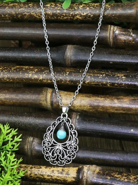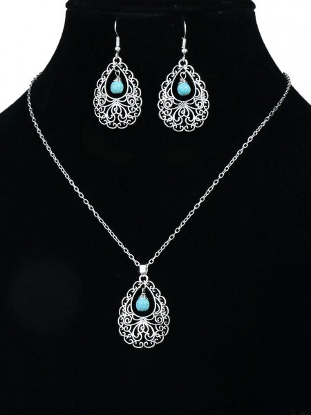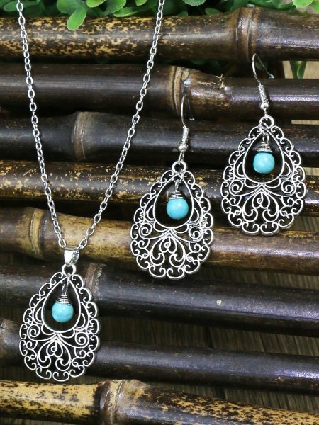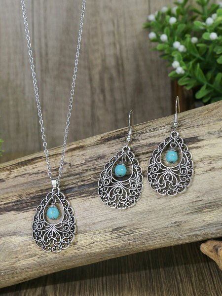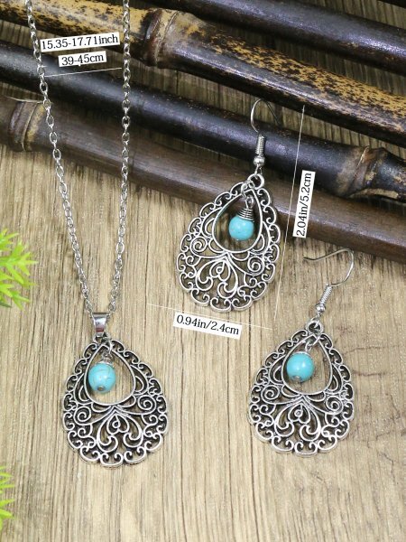 【新品】レディース ターコイズ 花柄彫刻 ヴィンテージアクセサリーセット◆天然石 フックピアス両耳+ネックレス パワーストーン ドロップ | |||