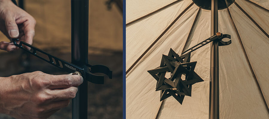 付け足して広がる利便性、ワンポールテントのポールやタープの大径メインポールサイズに対応したマルチハンガー。