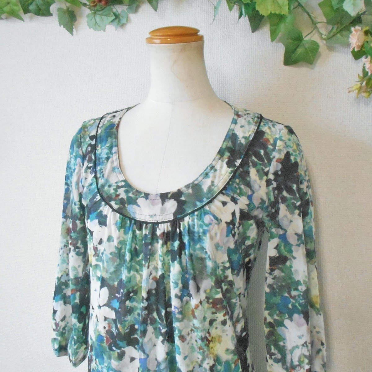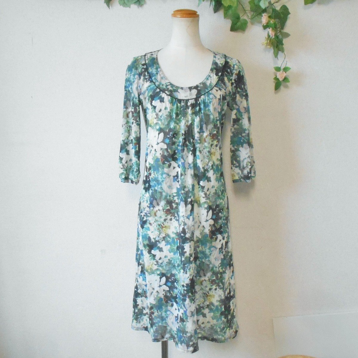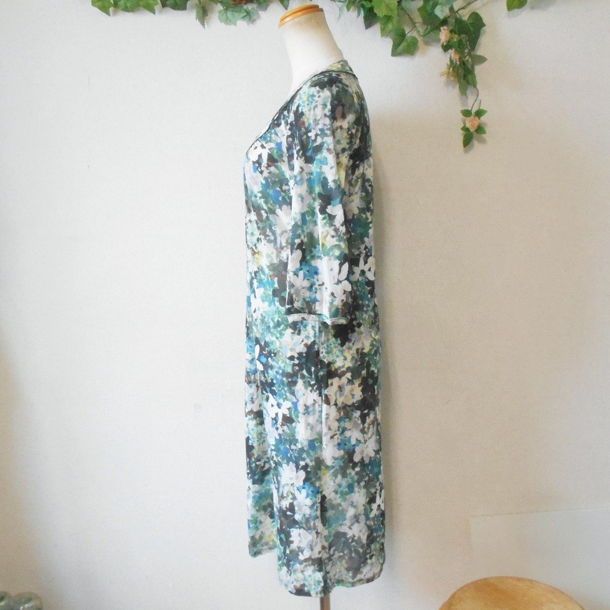 【ポイント】株)ワールド、スマートピンクのワンピースになります。お色は多色使用の花柄で6~7分袖くらいの夏を中心に着ていただけるお品です。細かいメッシュのような生地で、とっても素敵なデザインです。