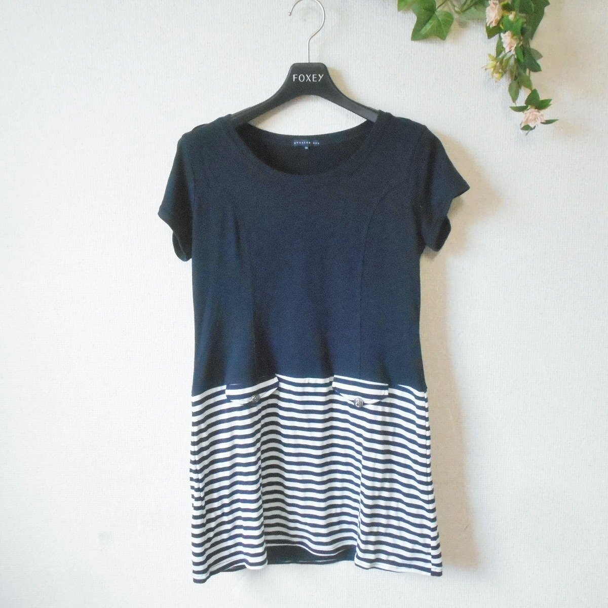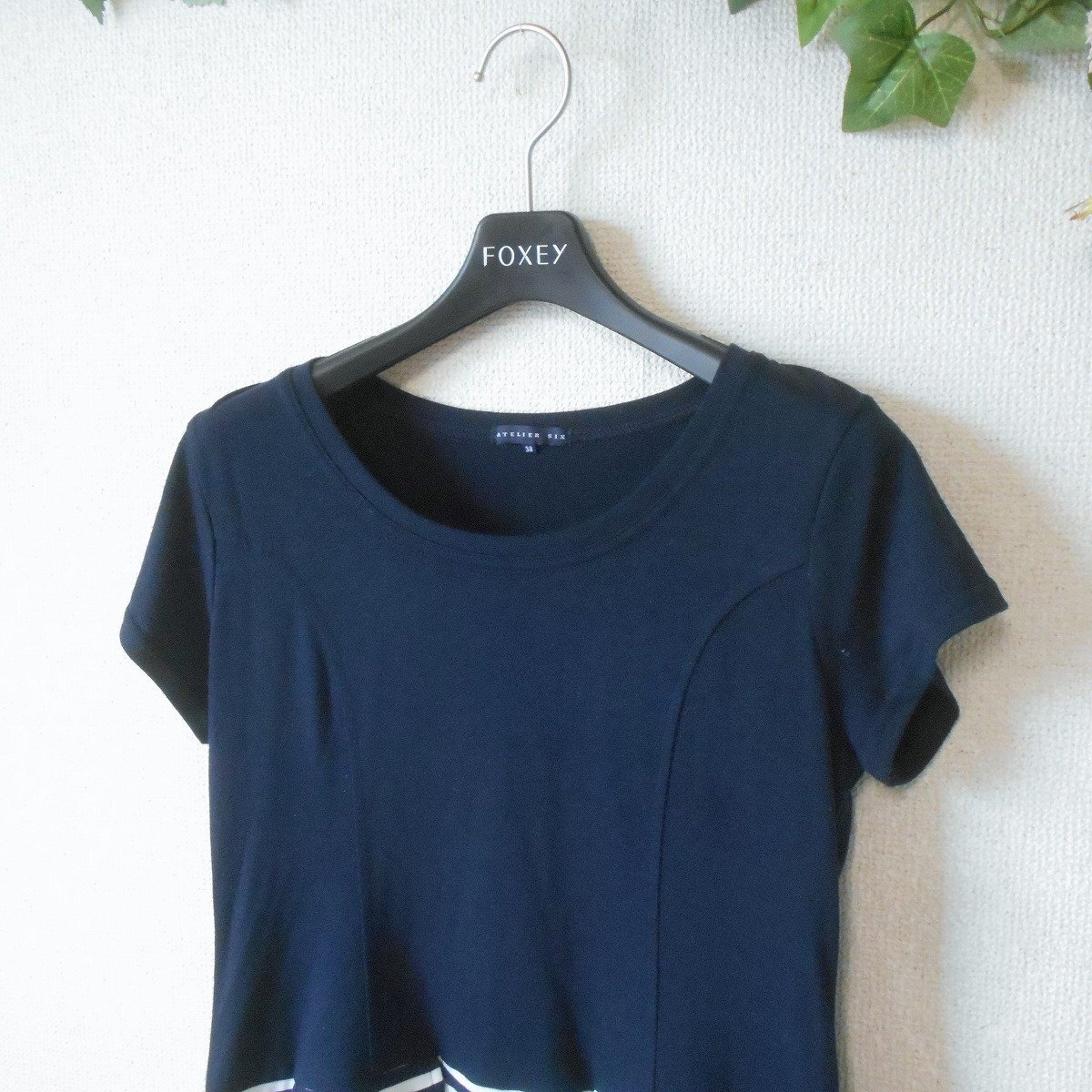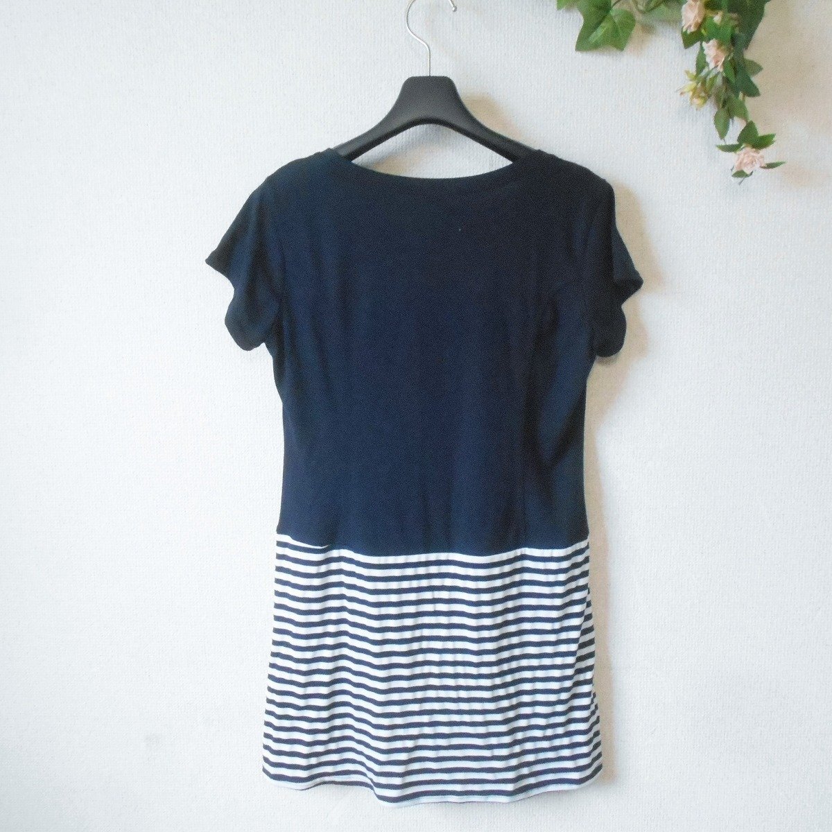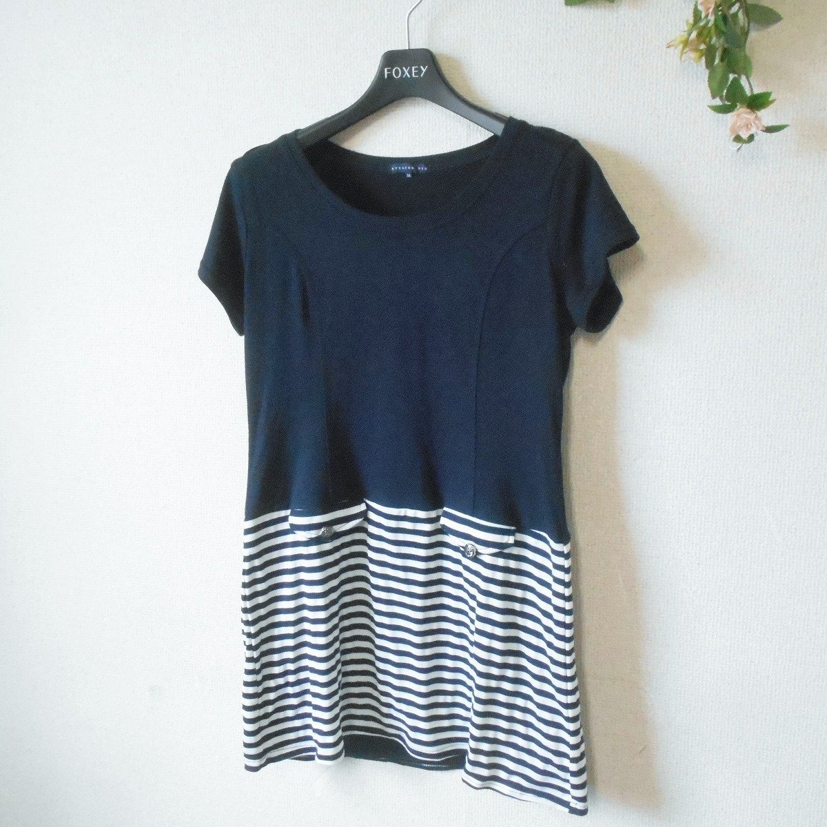 【ポイント】アトリエシックスのチュニックワンピースになります。お色は白とネイビーの2色使用で、スカート部分がボーダーに切替えられています。カットソー生地の春夏向きで、マリンルックのイメージで、とっても可愛い一着です。