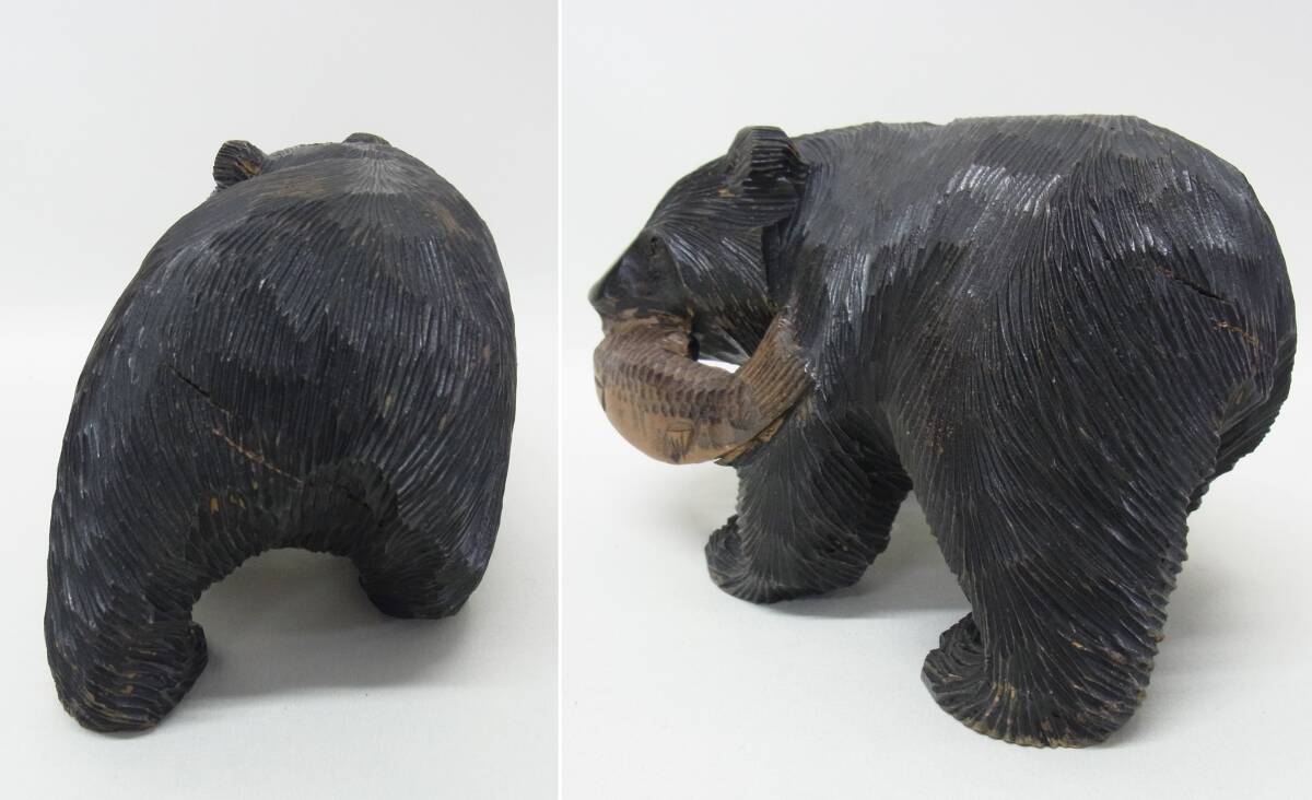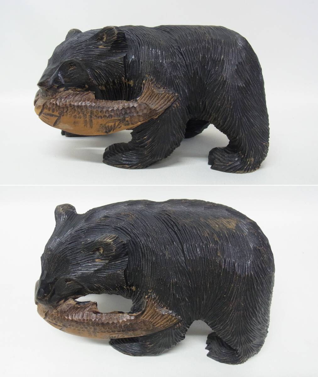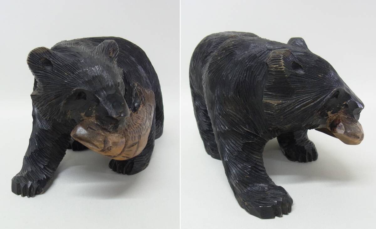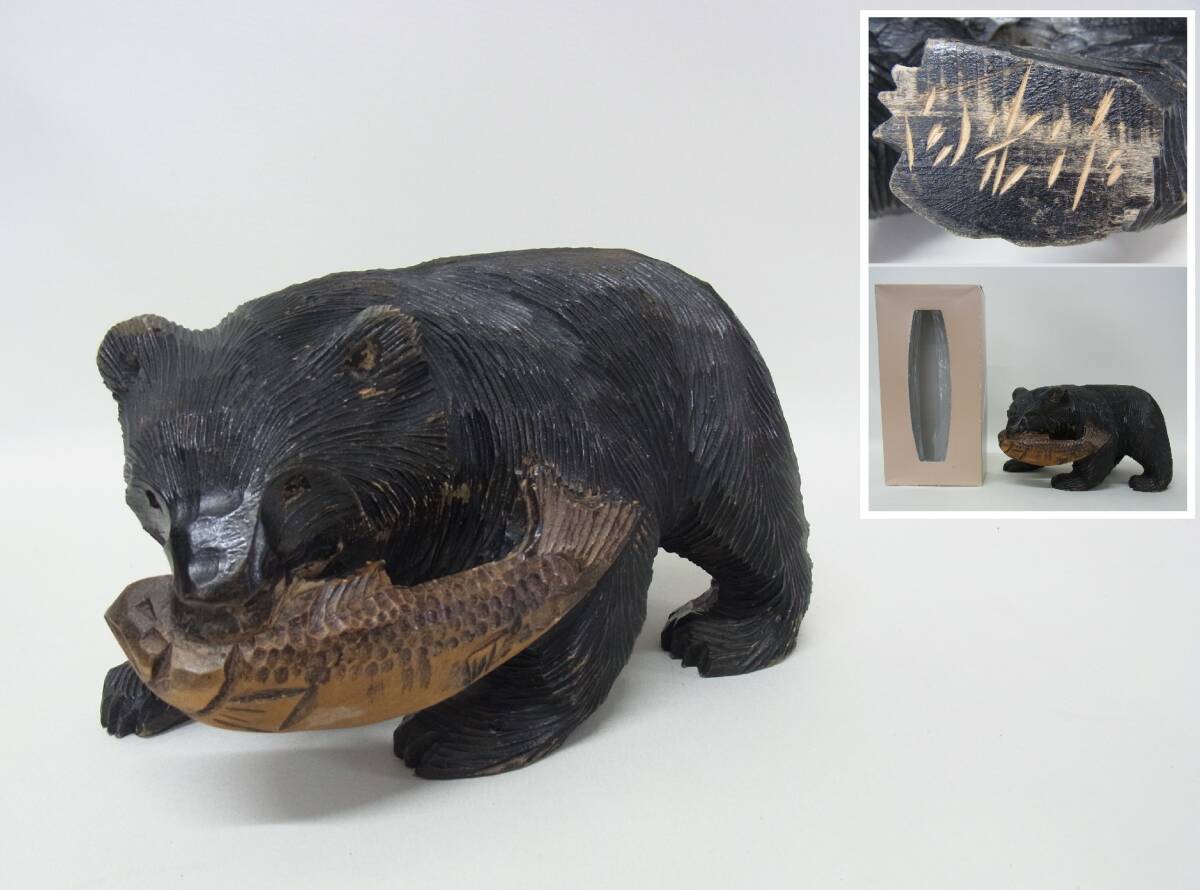 【K2】在銘 白光 飾りやすい大きさ☆木彫り 鮭くわえ熊 高さ約11.5cm☆摩周 木彫り熊 木彫 熊 鮭くわえ 置物 北海道 レトロ 昭和40年代 60 | |||