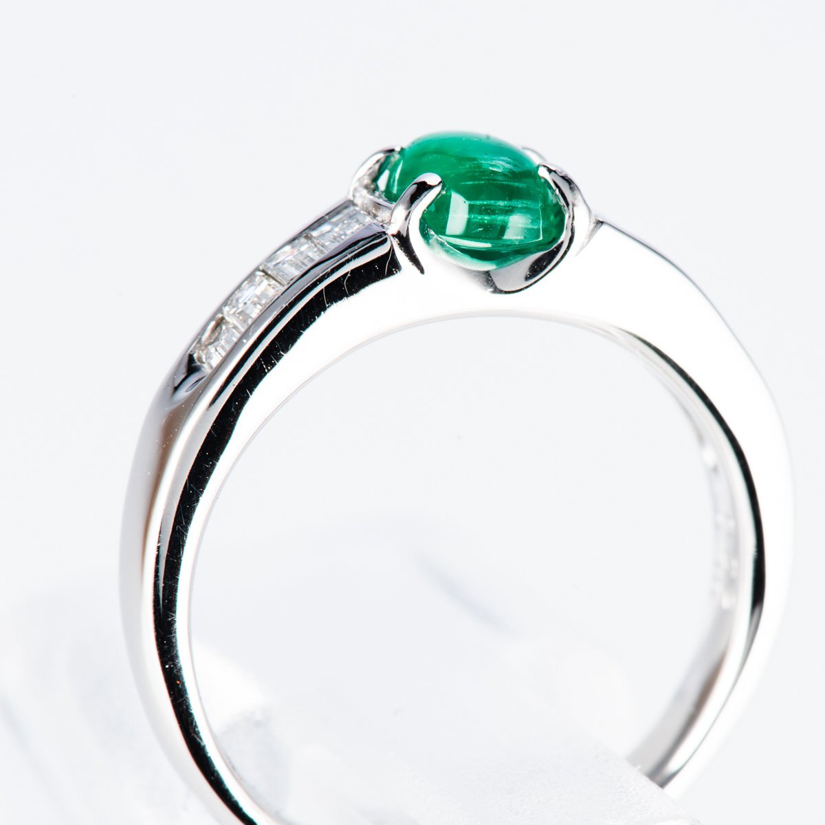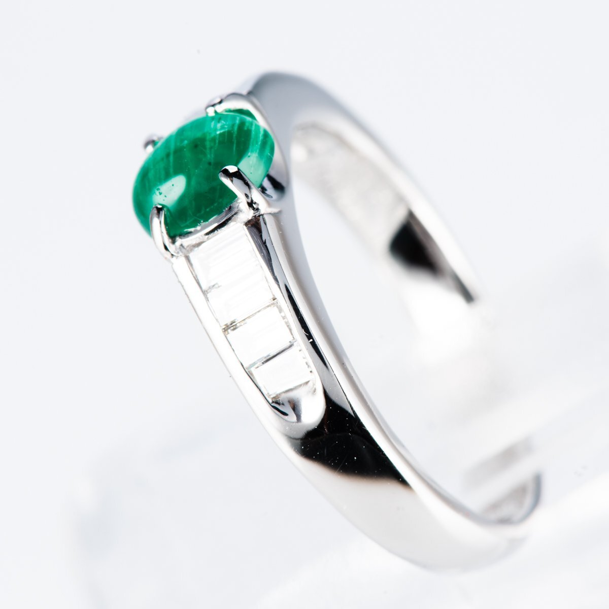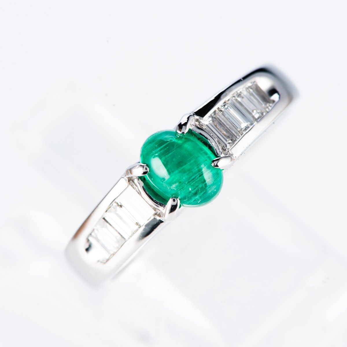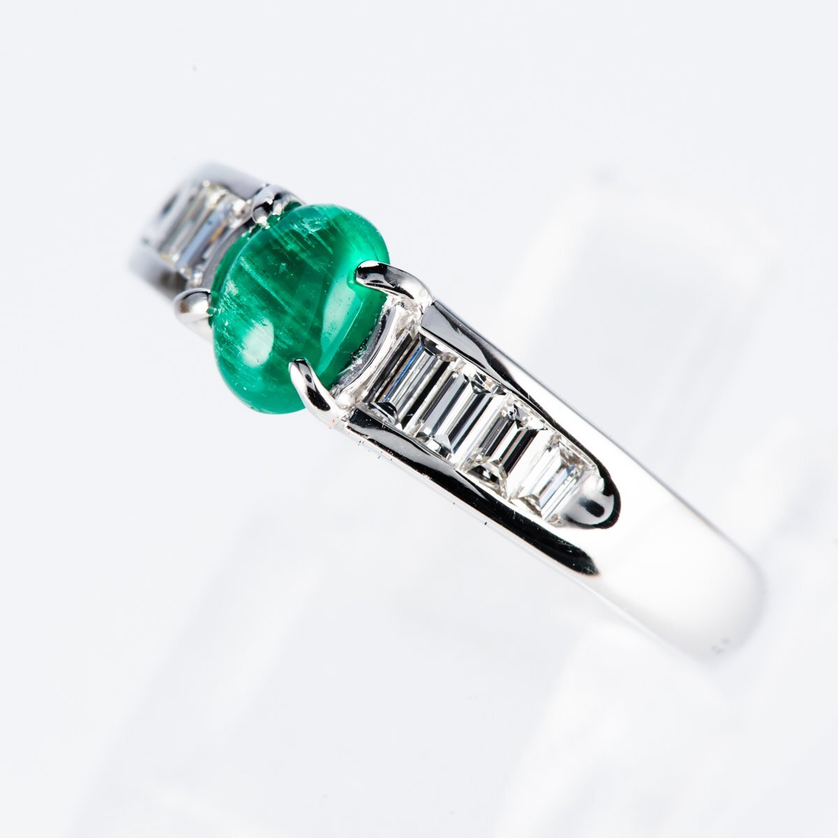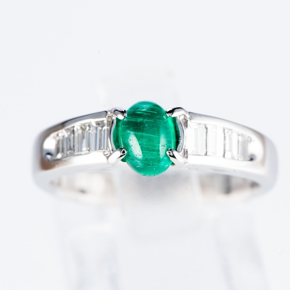 両サイドにバゲットカットのダイヤモンドがセッティングされていて、非常に落ち着いた輝きがセンターのエメラルドとなじんでいます。