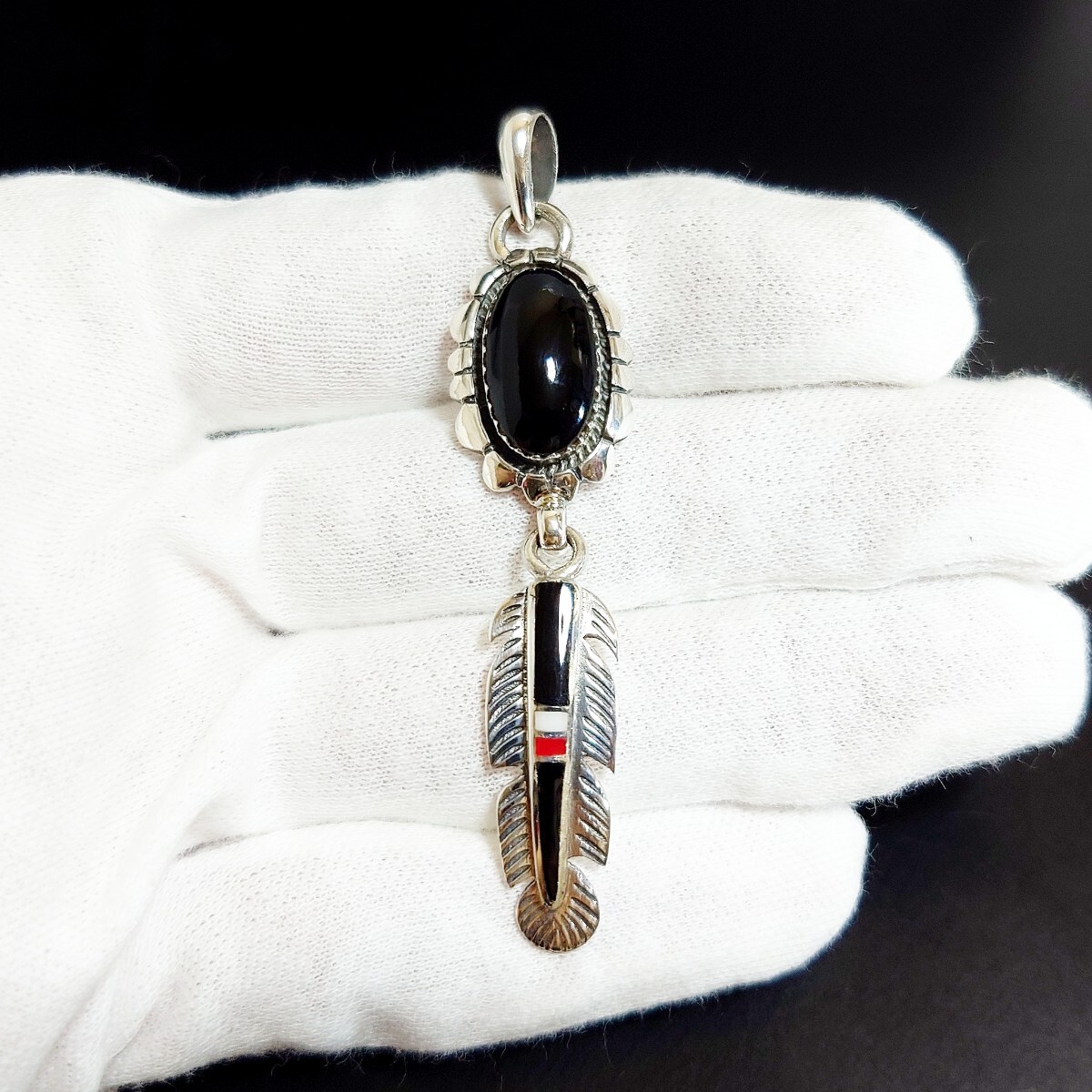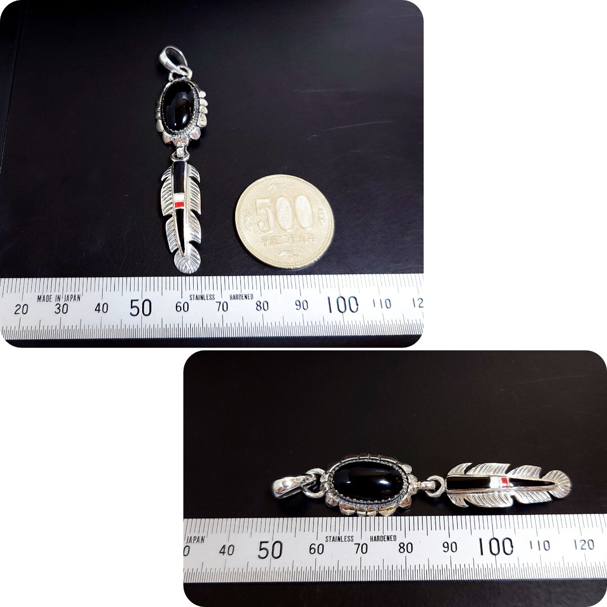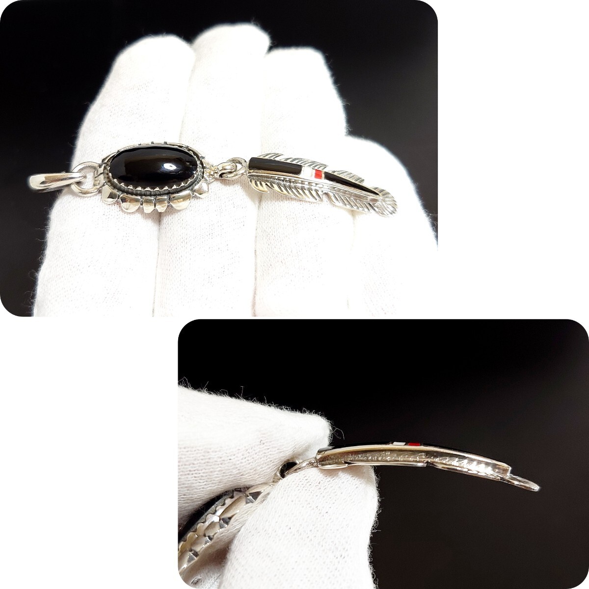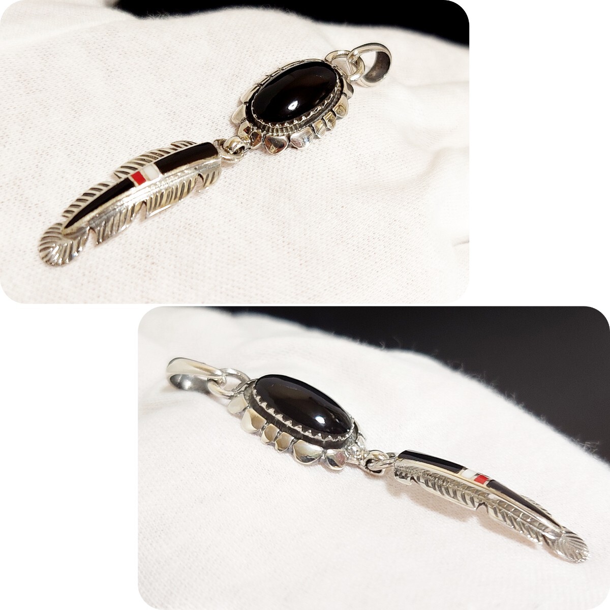 下のフェザーは揺れるデザインになっていて天然石のオニキス、ホワイトシェル、コーラルインレイワークで丁寧に作られています。