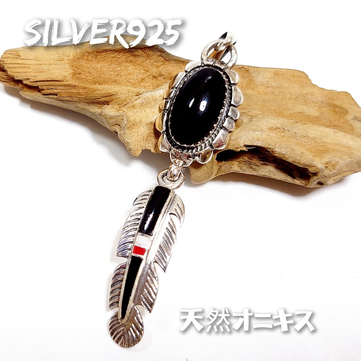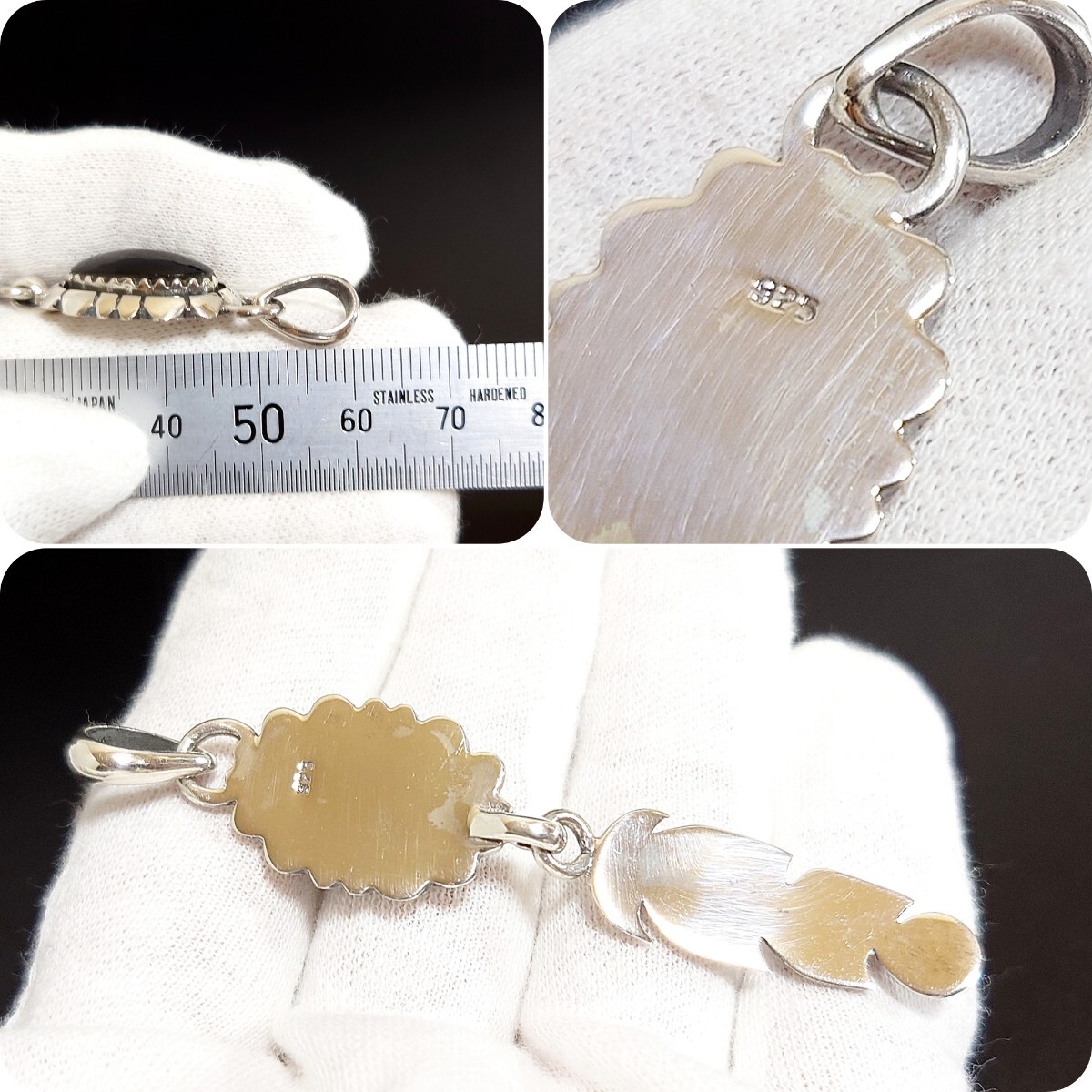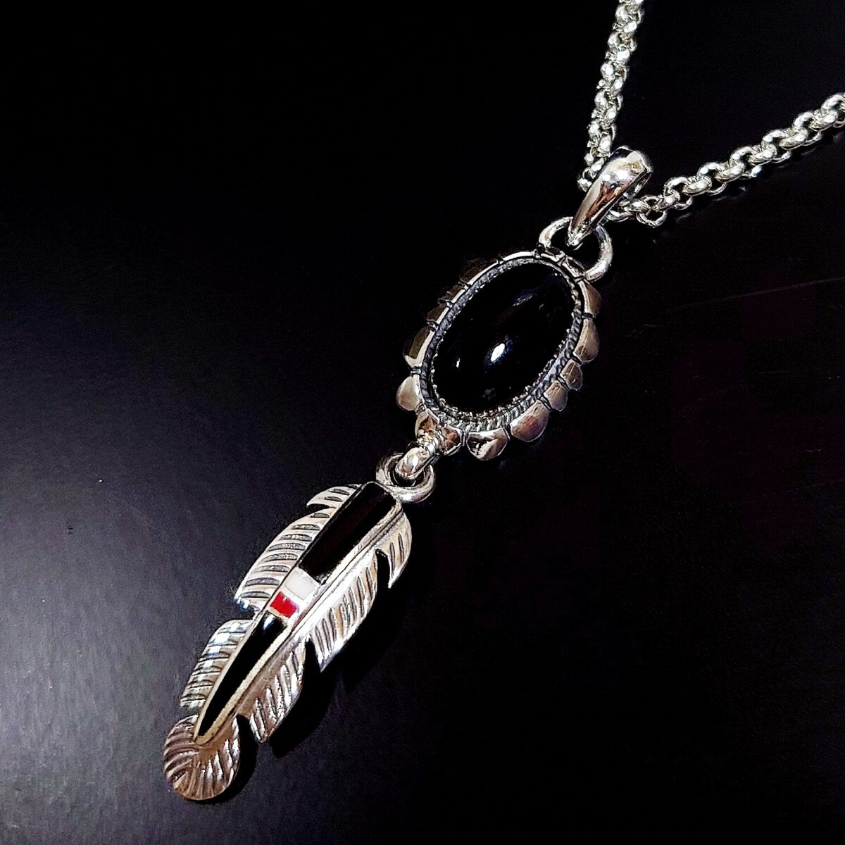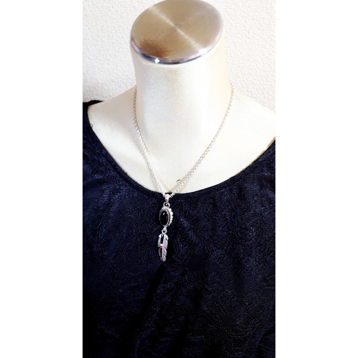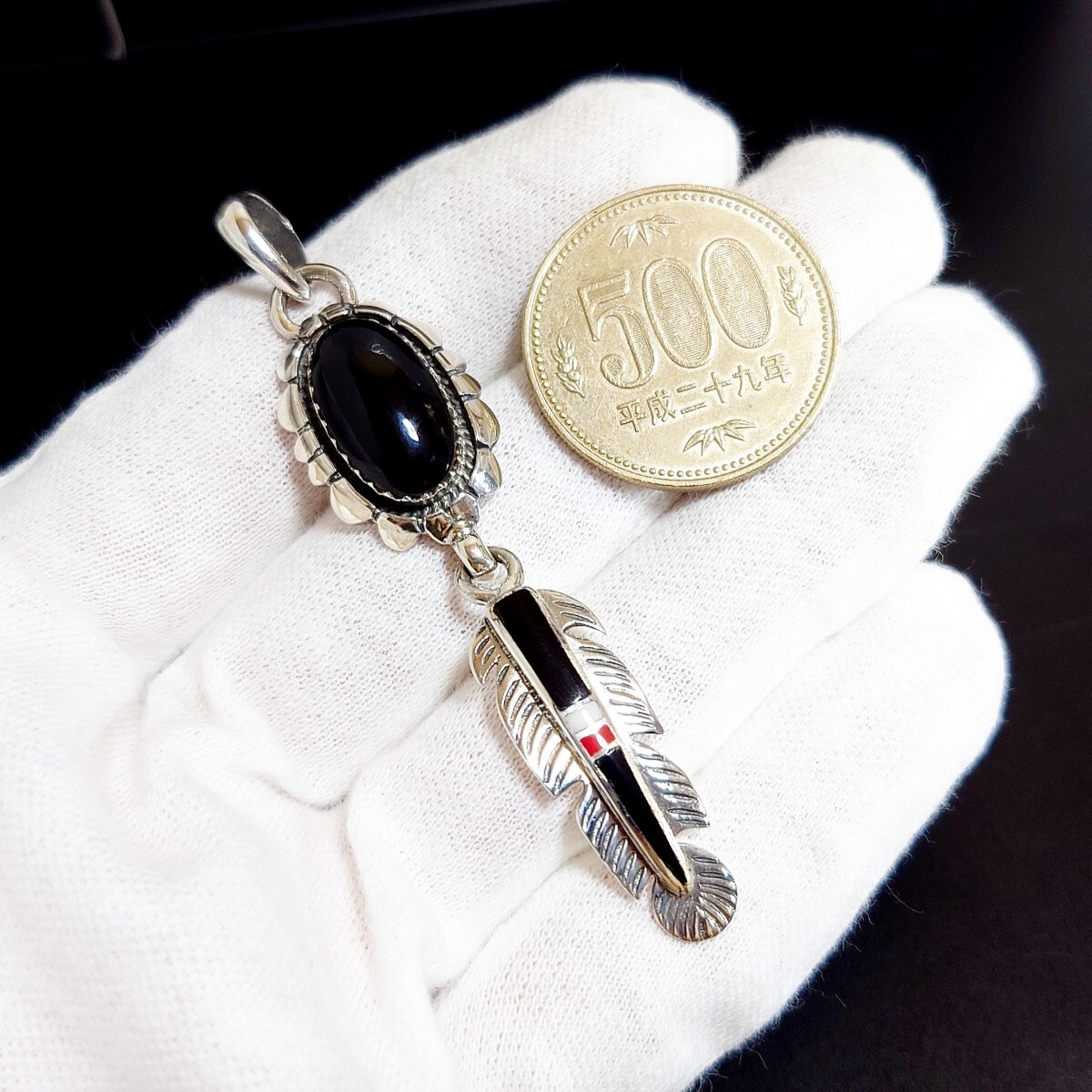 下のフェザーは揺れるデザインになっていて天然石のオニキス、ホワイトシェル、コーラルインレイワークで丁寧に作られています。