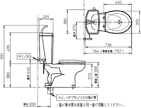 1つで4種配管(75・100/VU・VP)対応の排水ソケットを採用。