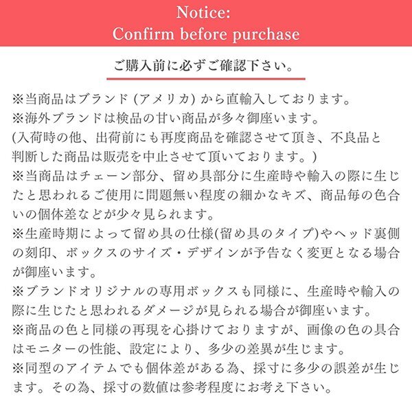 ※チェーン部分や留め具部分は、生産時や輸入の際に生じたと思われる (商品等に使用に問題無い程度の) 細かなキズが見られる場合が御座います。