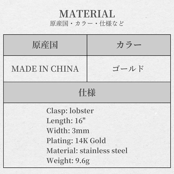チェーンにゴールドプレート加工 (Gold Plating) を施す事で、腐食や摩擦による抵抗を防ぎ、長く愛用できるよう工夫されています。