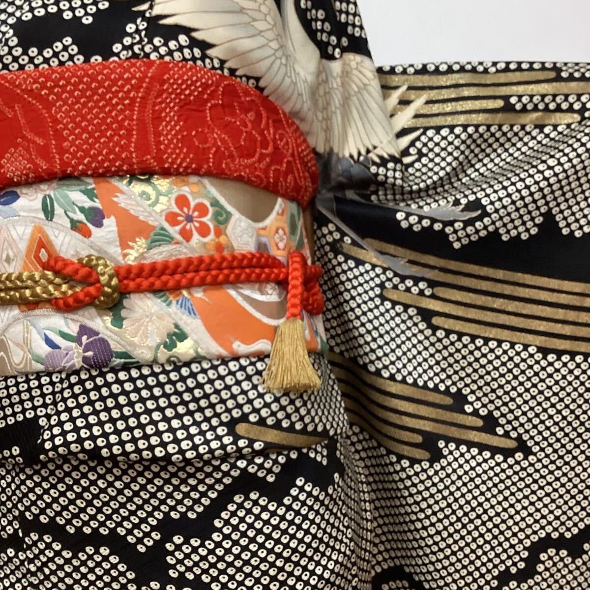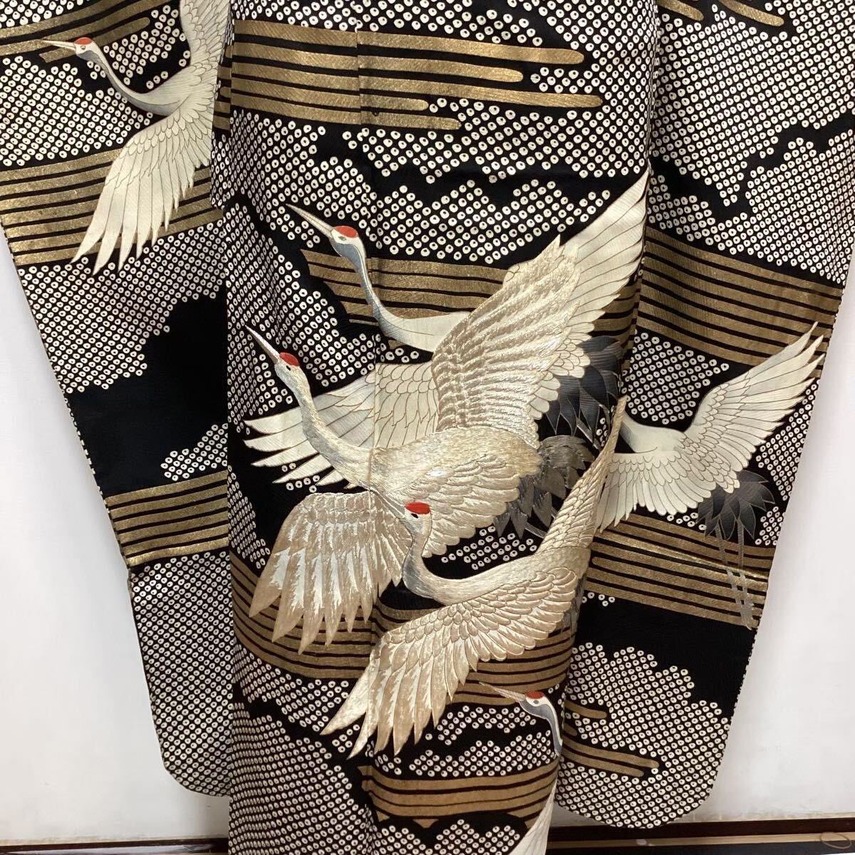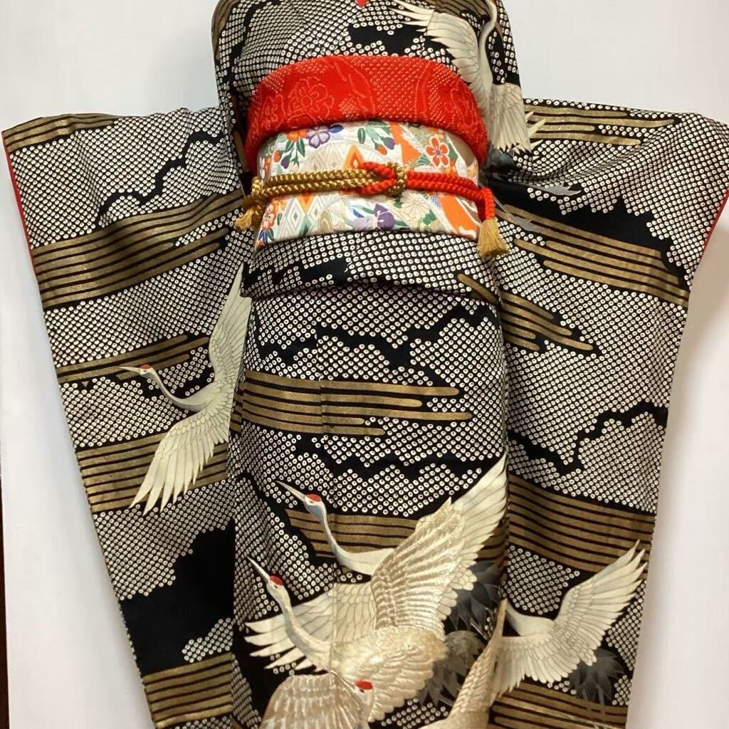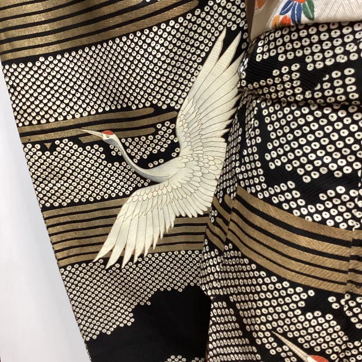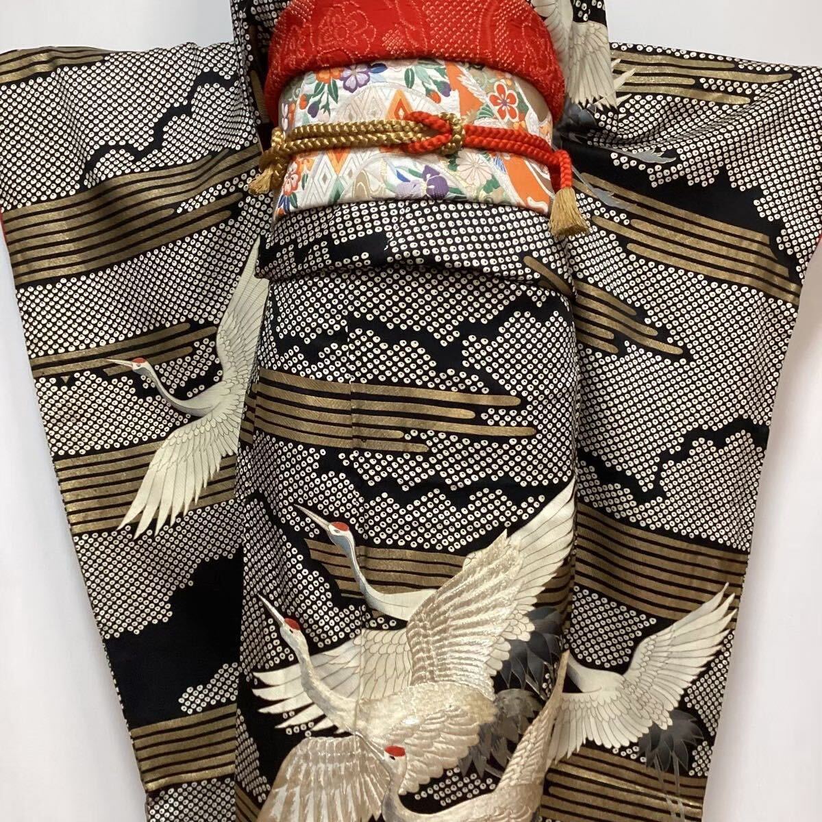 商品名 : アンティーク着物 黒地に鶴が映えて美しい着物です。裏地には多少の、のりアクががありますが、時代を経た品ですので、ご理解いただければと思います。表側は状態が良く目立つ汚れもないので着用には差し支えないと思います。帯は着付け用です。別の袋帯をお付けします。襦袢は一緒にお仕立てした物では有りません、多少の寸法のズレは有ります。