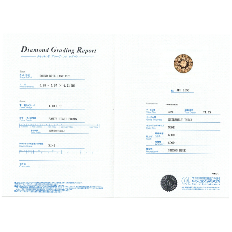 品質について | FANCY LIGHT BROWN SI1 ※日本で一番支持されている中央宝石研究所の鑑定書付きです! |