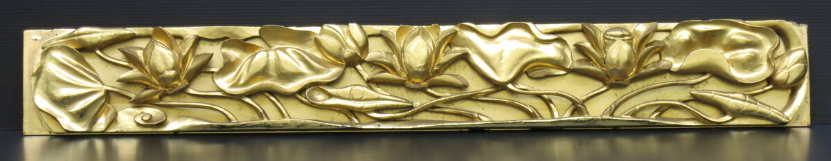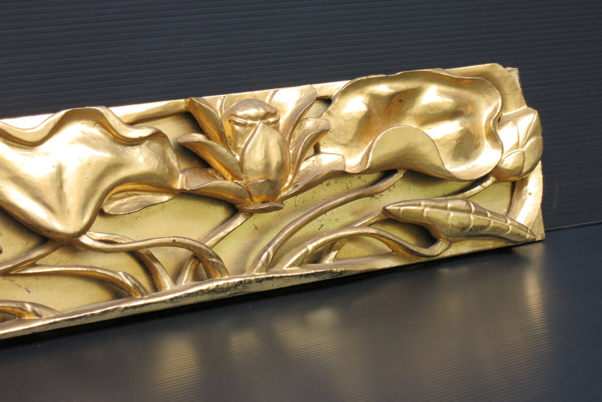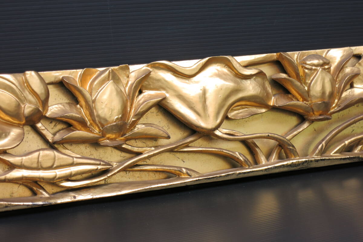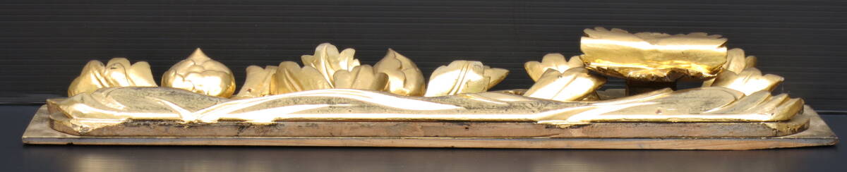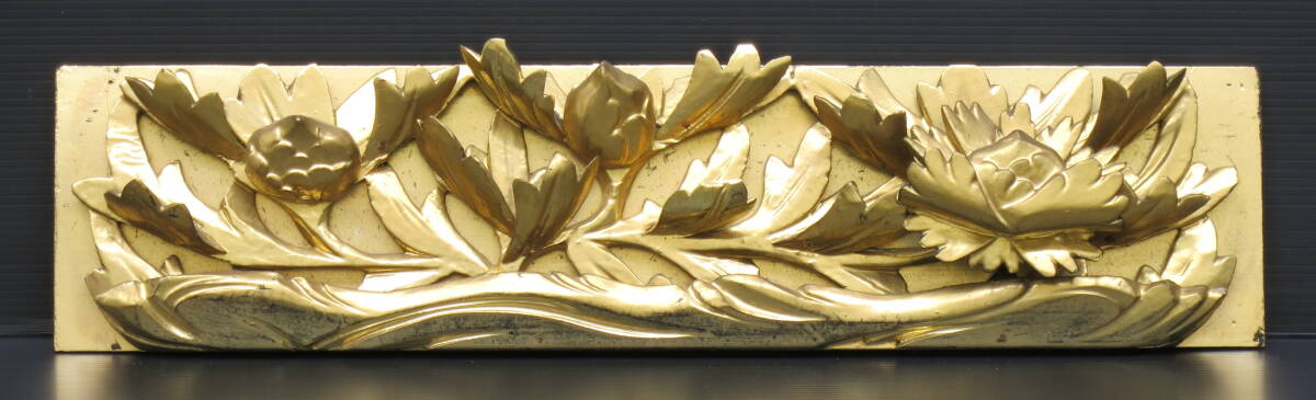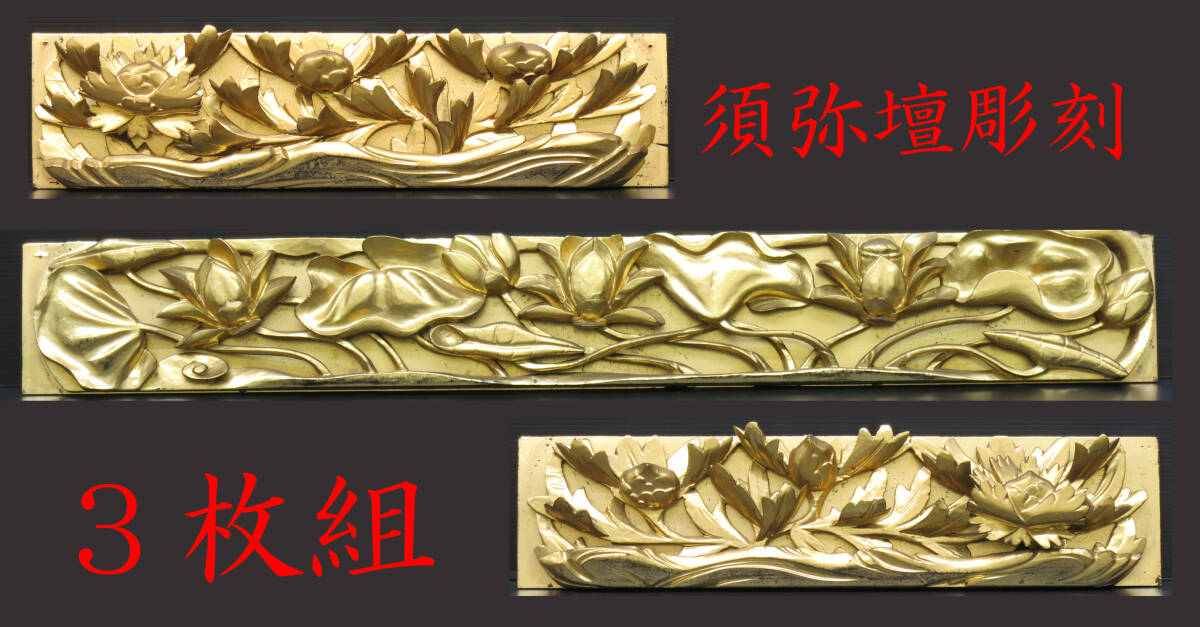 | 【リユース品】須弥壇彫刻3枚組 蓮彫刻 牡丹彫刻 前卓 前机 欄間 寺院仏具 本金箔 |
