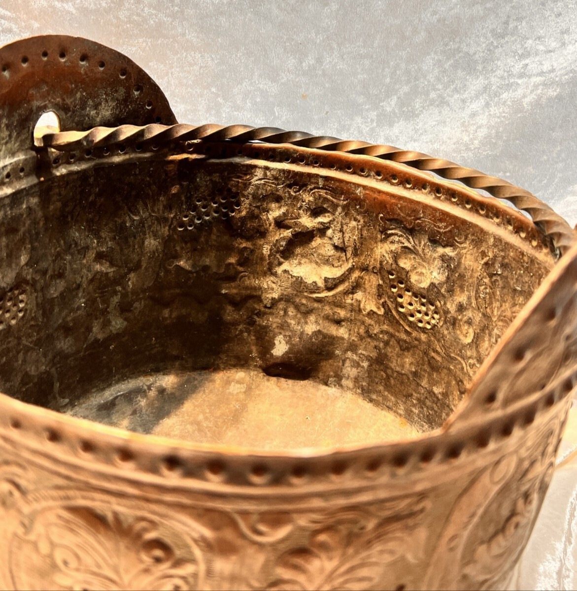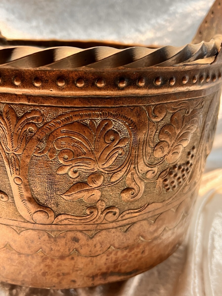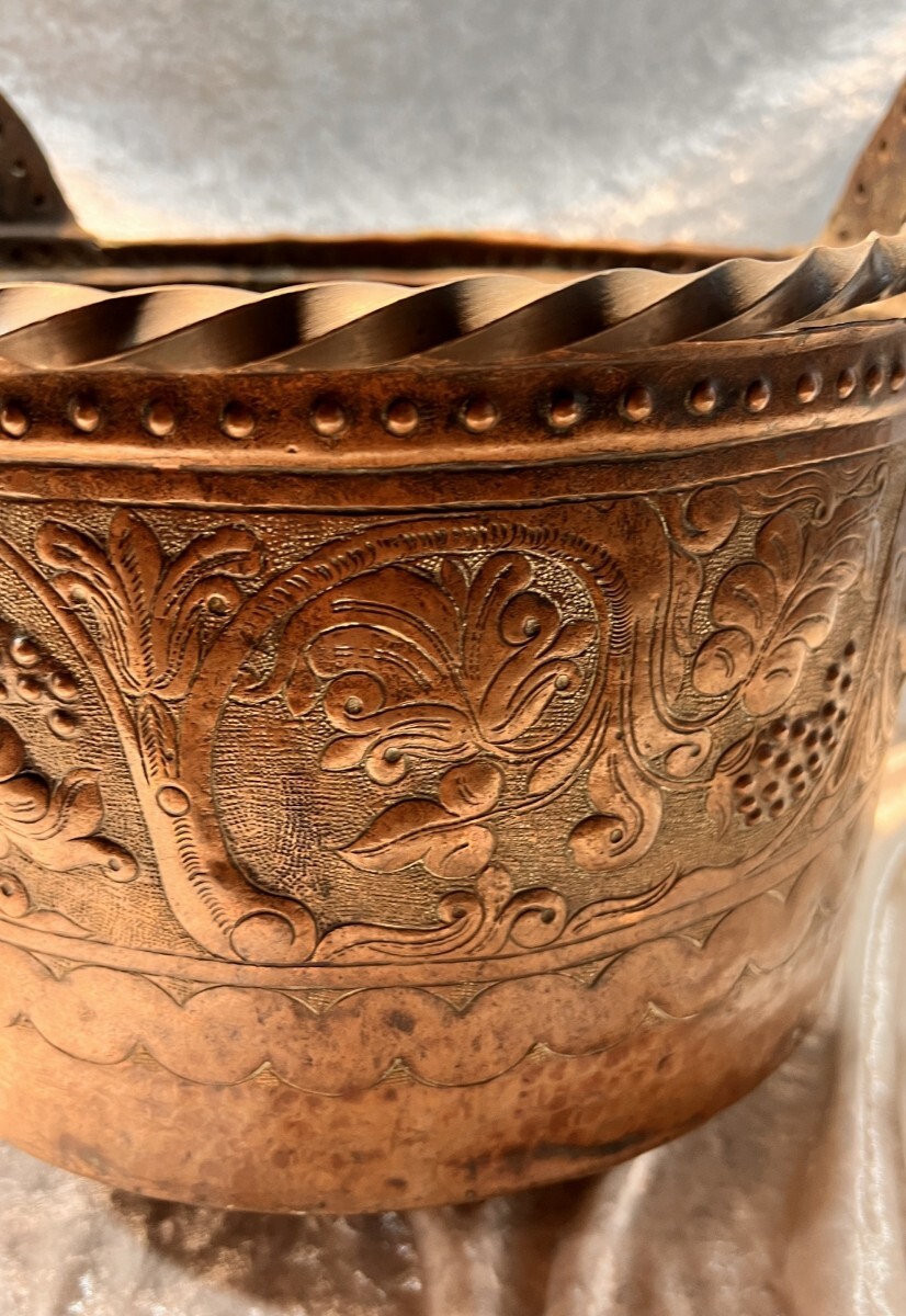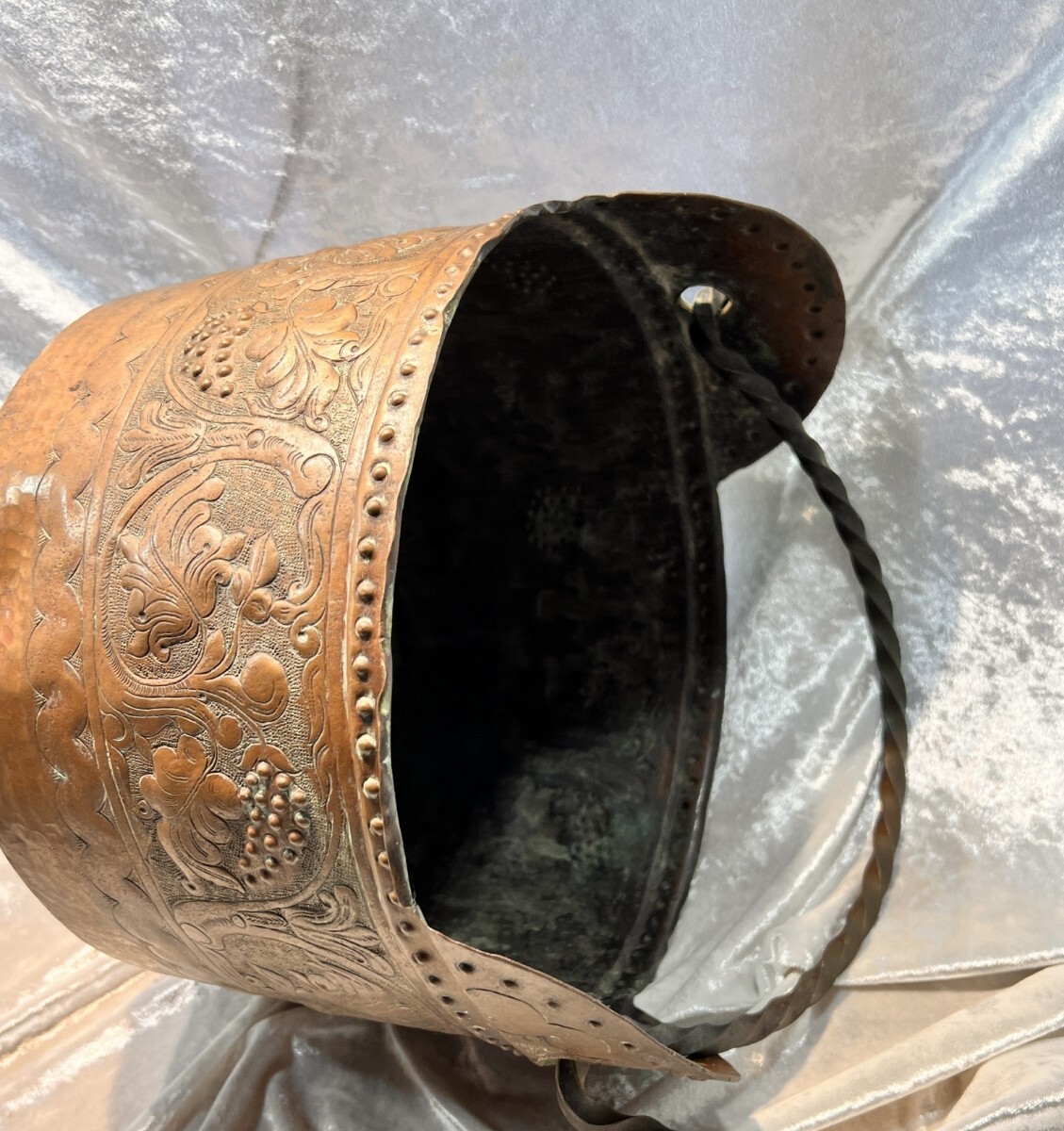 【雑貨・古民具】銅製の古いバケツ 持ち手付き 葡萄のデザイン 彫りと打ち出し技法 大きな鉢 バスケット 物入れ インテリア用品 ディスプレイ用品 骨董品 アンティーク商品説明+++ 商品名:銅製の古いバケツ