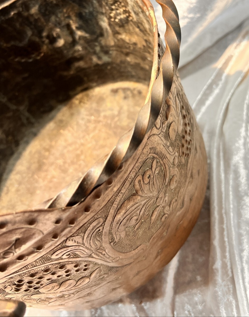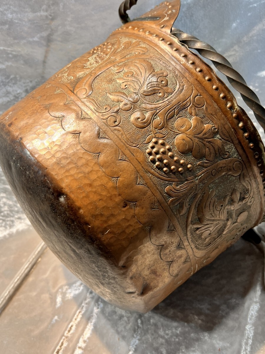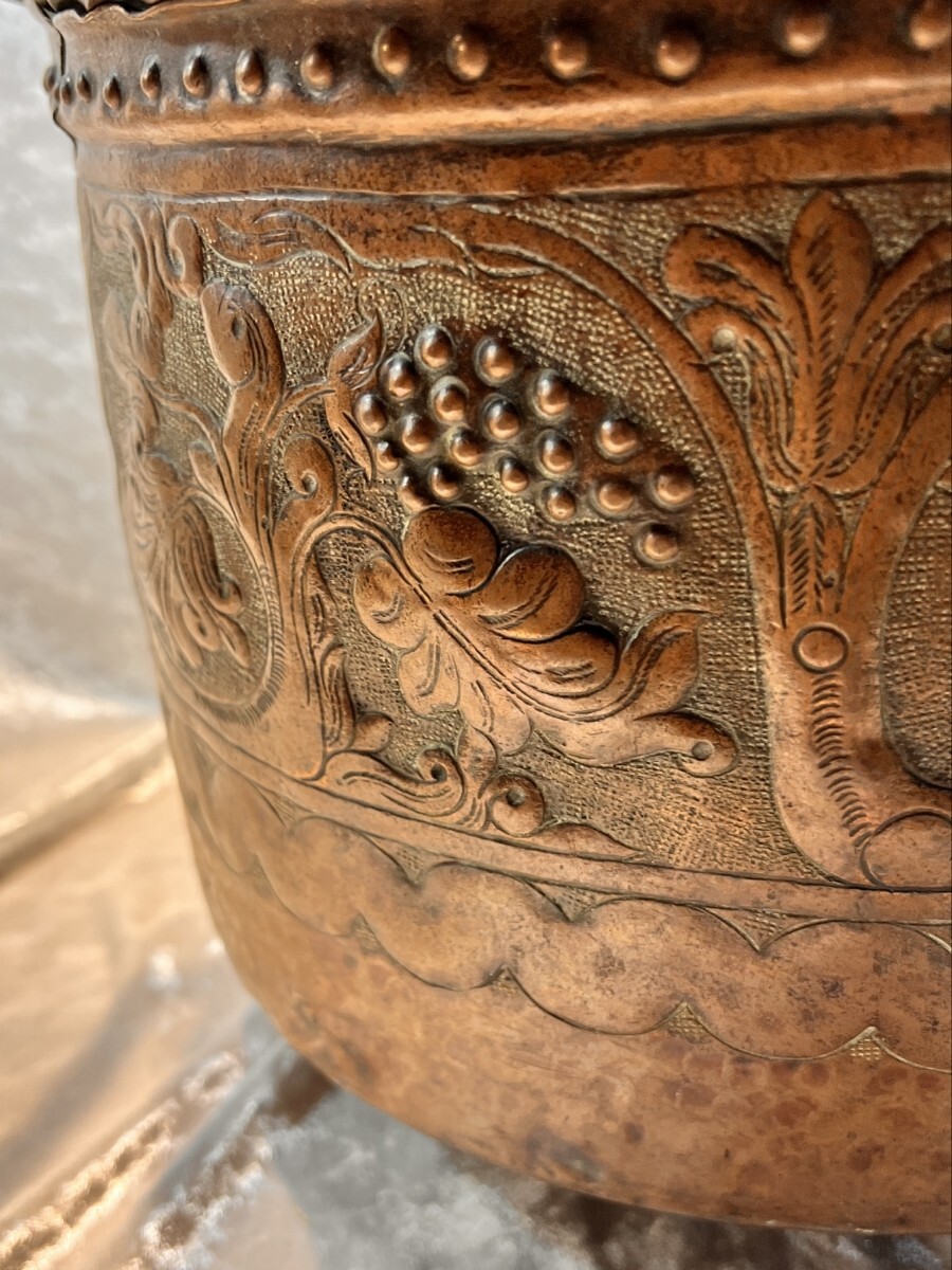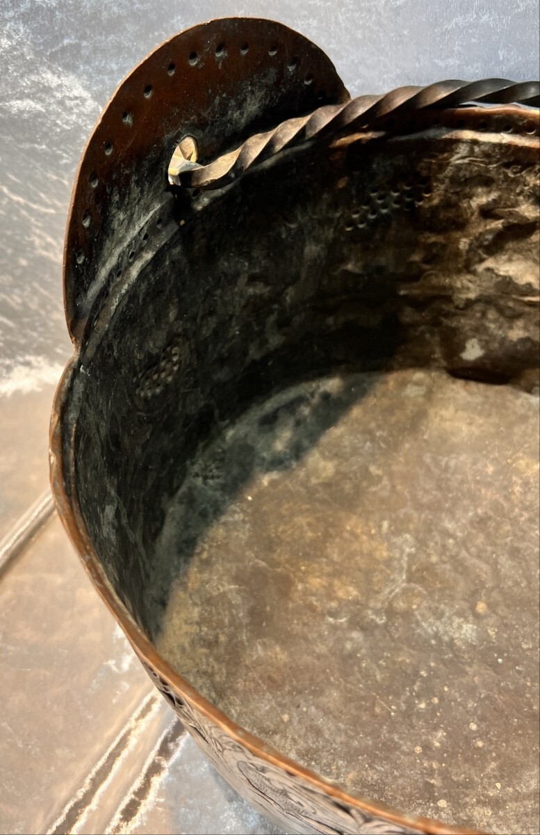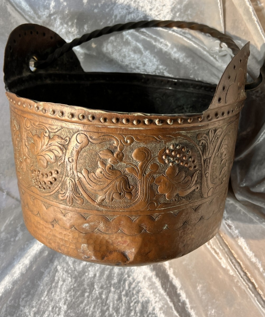 【雑貨・古民具】銅製の古いバケツ 持ち手付き 葡萄のデザイン 彫りと打ち出し技法 大きな鉢 バスケット 物入れ インテリア用品 ディスプレイ用品 骨董品 アンティーク商品説明+++ 商品名:銅製の古いバケツ