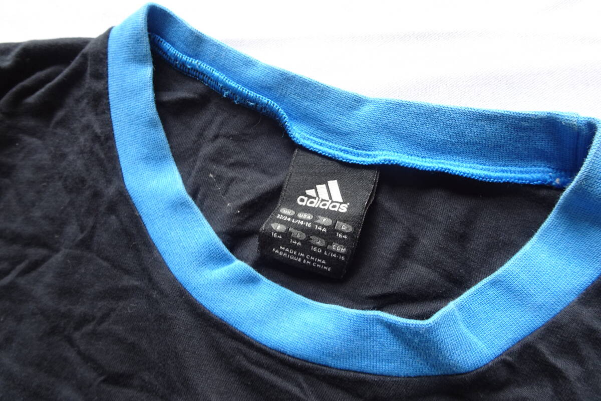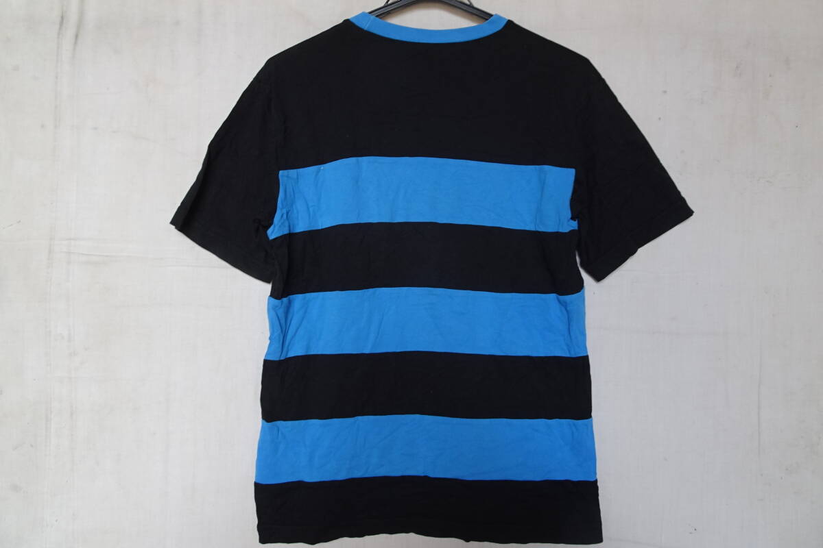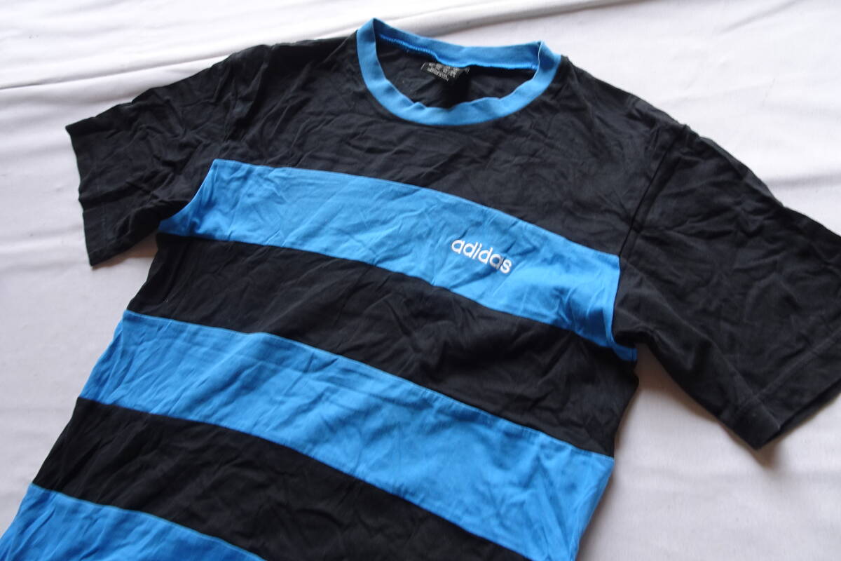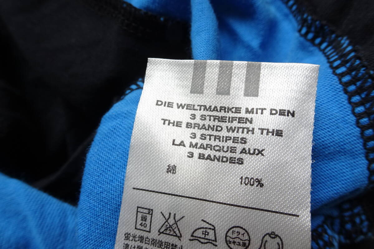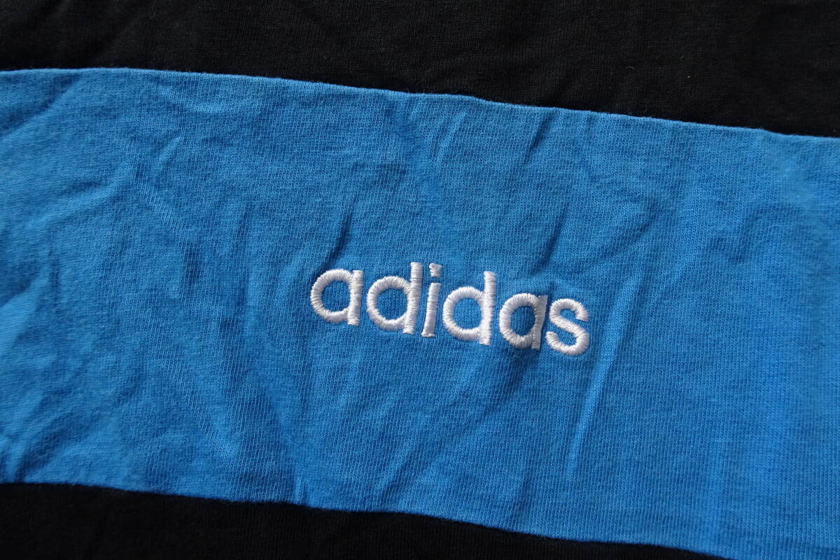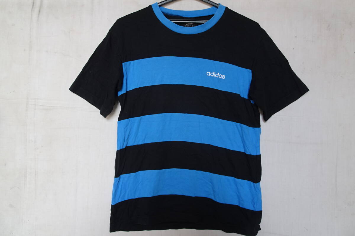 adidas/アディダス/ジュニア/子ども/半袖Tシャツ/極太ボーダー柄切替/ブランドネームししゅう/黒/ブラック/水色/160サイズ(8/6R)