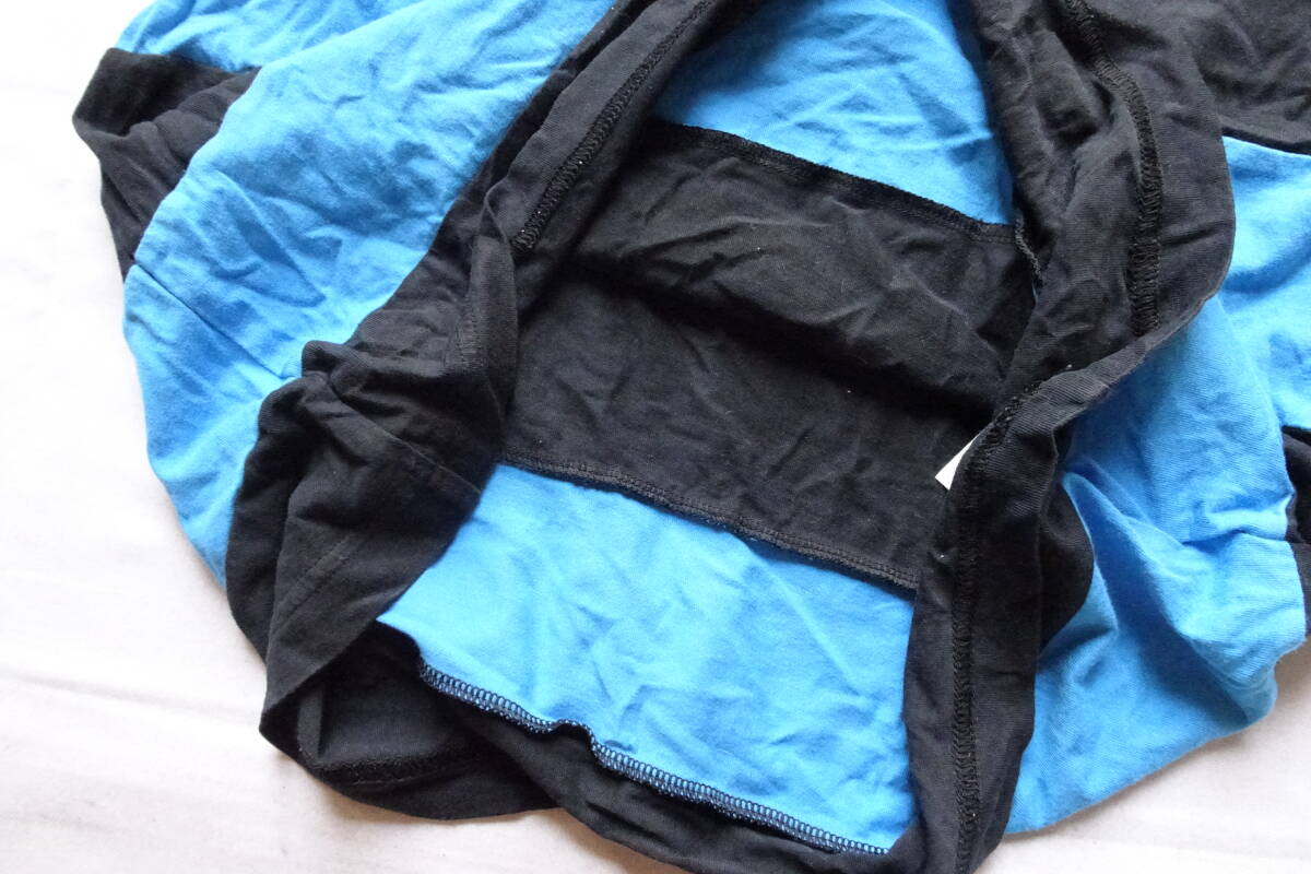 身頃は、黒と水色の極太ボーダー柄切替です。