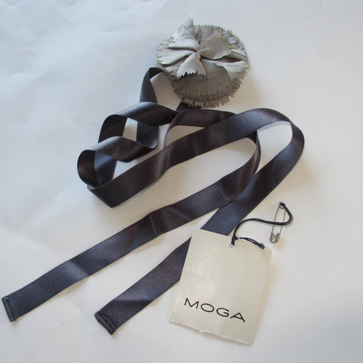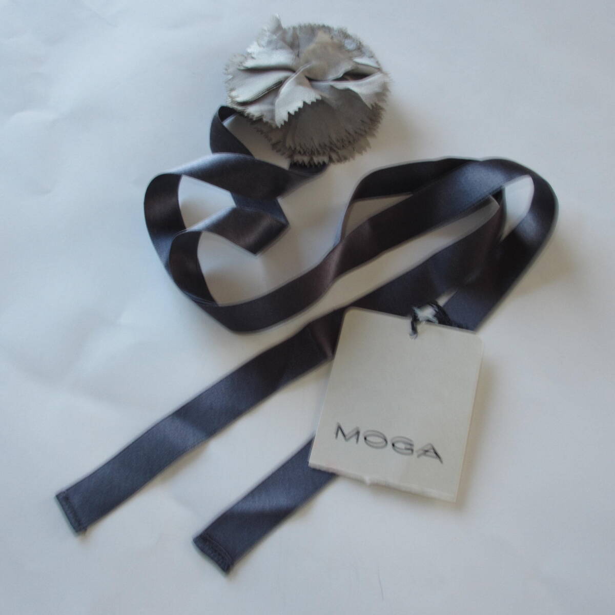 グレー地色でMOGAのシフォンのコサージュとリボンの、