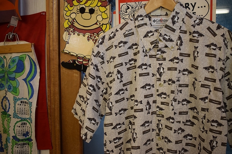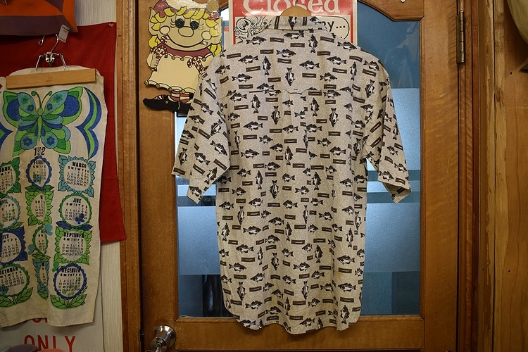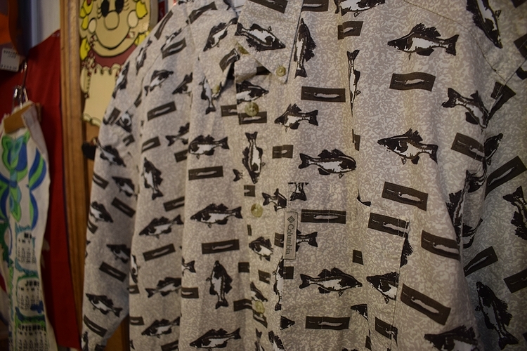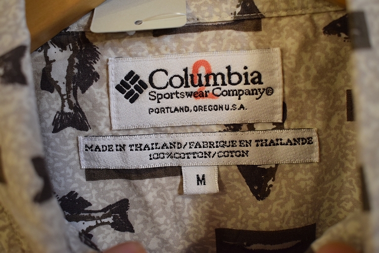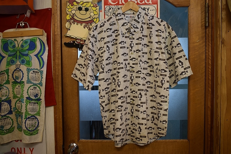 グッドスタイル90sビンテージColombiaコロンビア半袖ボタンダウン総柄シャツオールコットン魚柄アメカジストリートアウトドアh25105