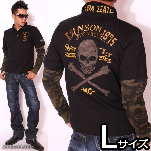 当店別注 VANSON バンソン フェイクレイヤード 長袖 ポロシャツ ブラック×袖グリーンカモ【Lサイズ 】NVPS-519 バイカー アメカジ 刺繍