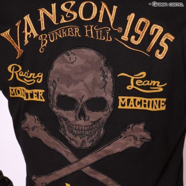 『アメリカが生んだ革の魔術師』高品質で世界中に愛される伝説のバイカーズブランド【VANSON(バンソン)】、カモフラ スカル 刺繍 フェイクレイヤード 長袖ポロ!