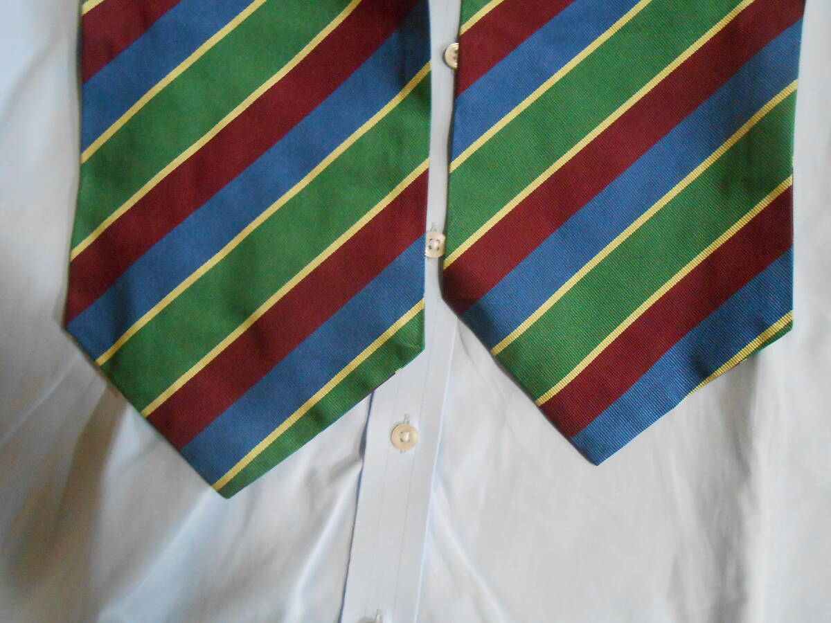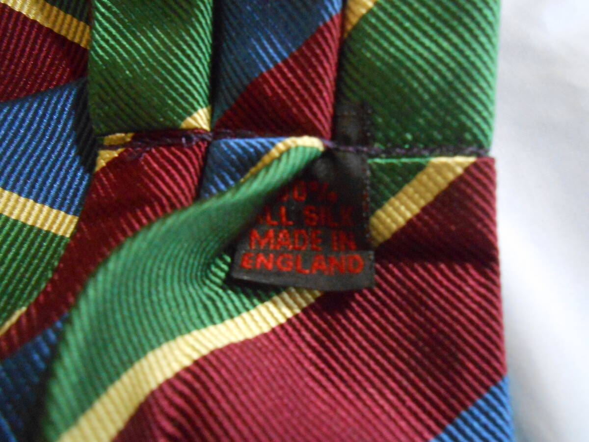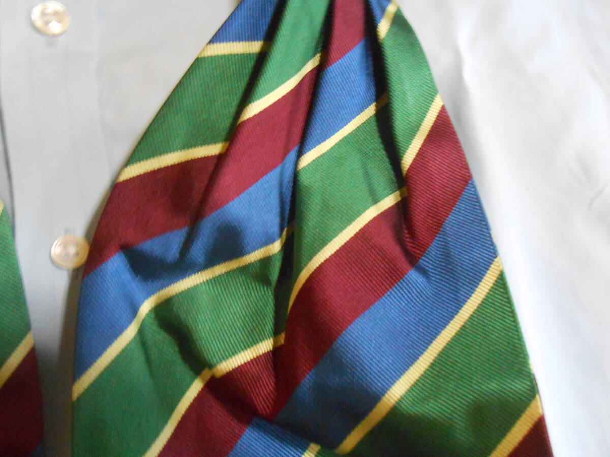 ちょっと旧い時代のデッドストックの英国製のブルー&グリーン&マルーンと細いイエローのラインの美しいレジメンタルのアスコットタイ/スカーフ。上質な厚手のシルク00%でかなりの高級感があります。保管に伴い僅かな皺はありますが、素晴らしい状態の逸品で、私がコレクションとして所有していたものです。一番広いところ:約15cm&長さ:約130cmです。