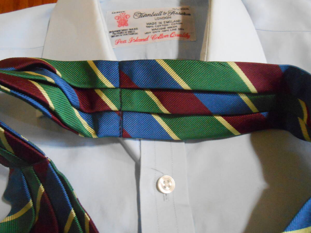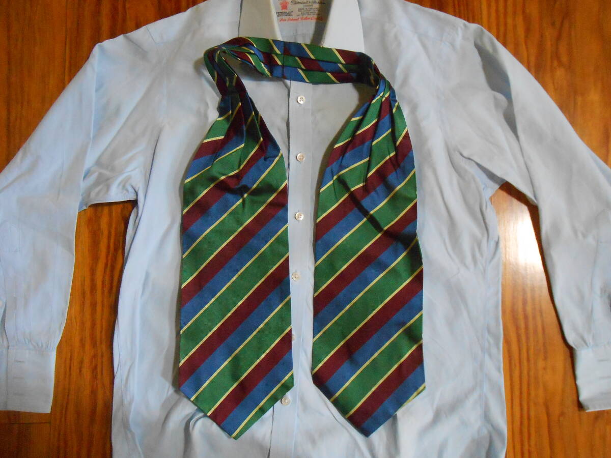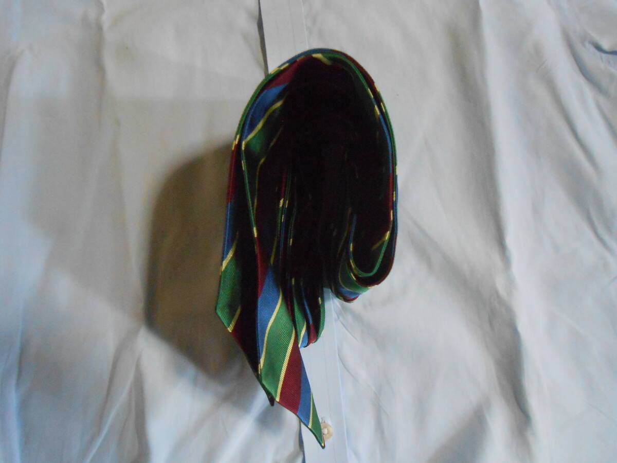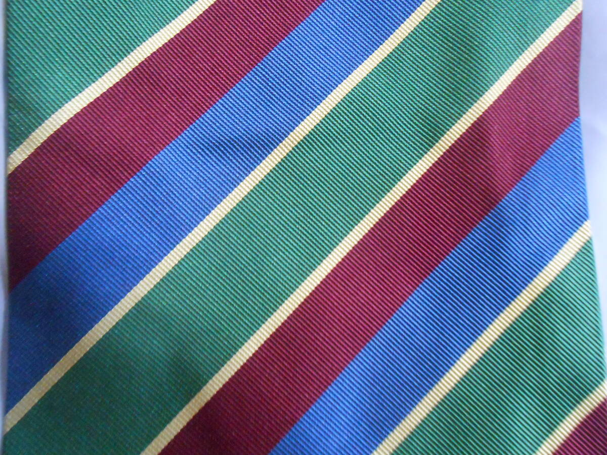 ちょっと旧い時代のデッドストックの英国製のブルー&グリーン&マルーンと細いイエローのラインの美しいレジメンタルのアスコットタイ/スカーフ。上質な厚手のシルク00%でかなりの高級感があります。保管に伴い僅かな皺はありますが、素晴らしい状態の逸品で、私がコレクションとして所有していたものです。一番広いところ:約15cm&長さ:約130cmです。