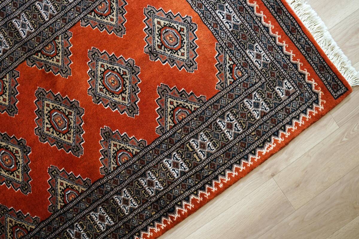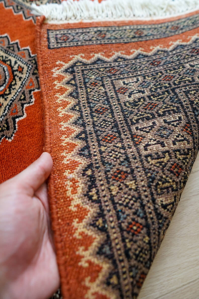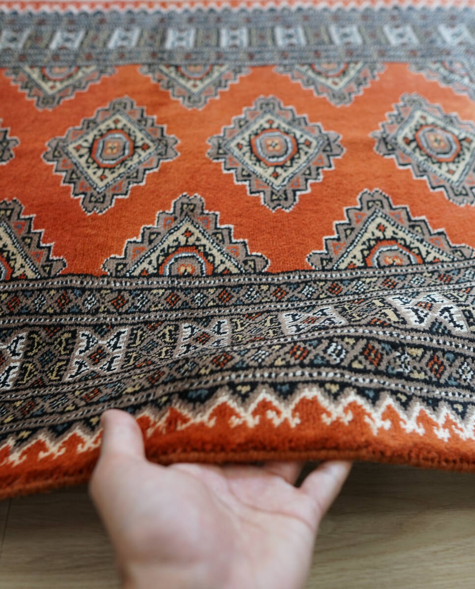 上質なウールに草木染めを施し、職人が手織りしたパキスタン絨毯です。しなやかで扱いやすく、弾力のある柔らかいパイル地が底冷えを防ぎ足元を快適にします。