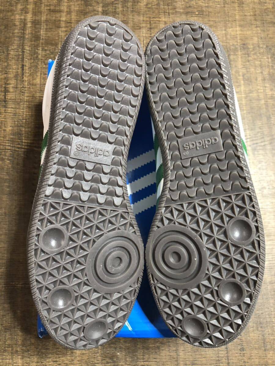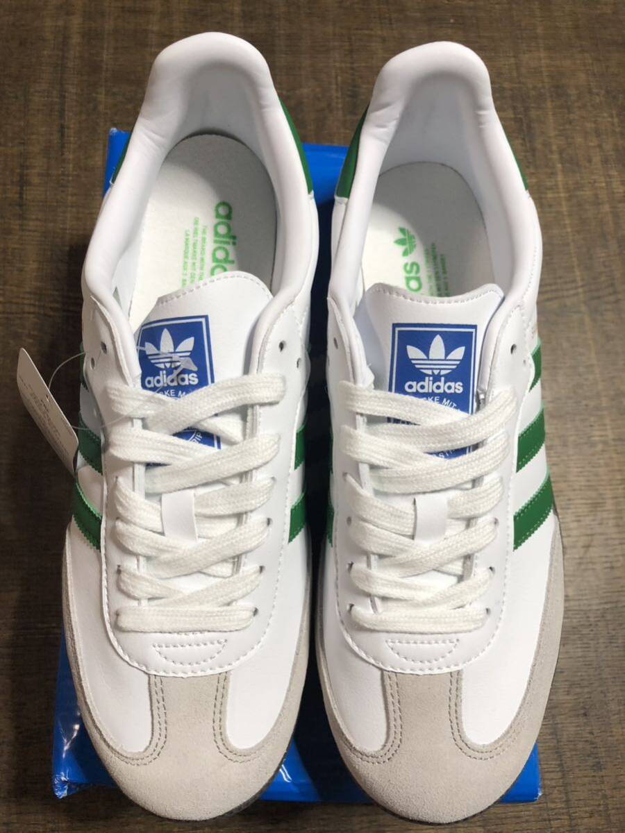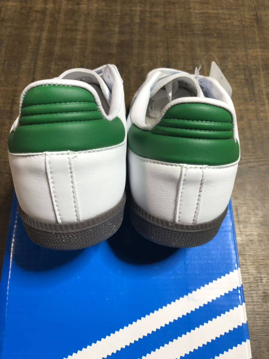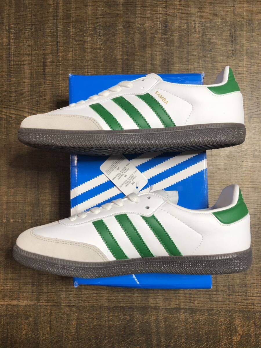 未使用新品のadidas ORIGINALS『SAMBA OG』です。サイズは27.5cmで、ホワイトのアッパーにグリーンの三本線が入っています。箱はありますが、傷んでいますので梱包材程度であるとご了承ください。以上ご了承の上でご入札ください。