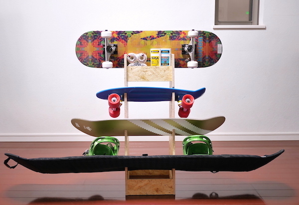スケートボードのデッキやスノーボードを合計4枚をキレイに収納できます。
