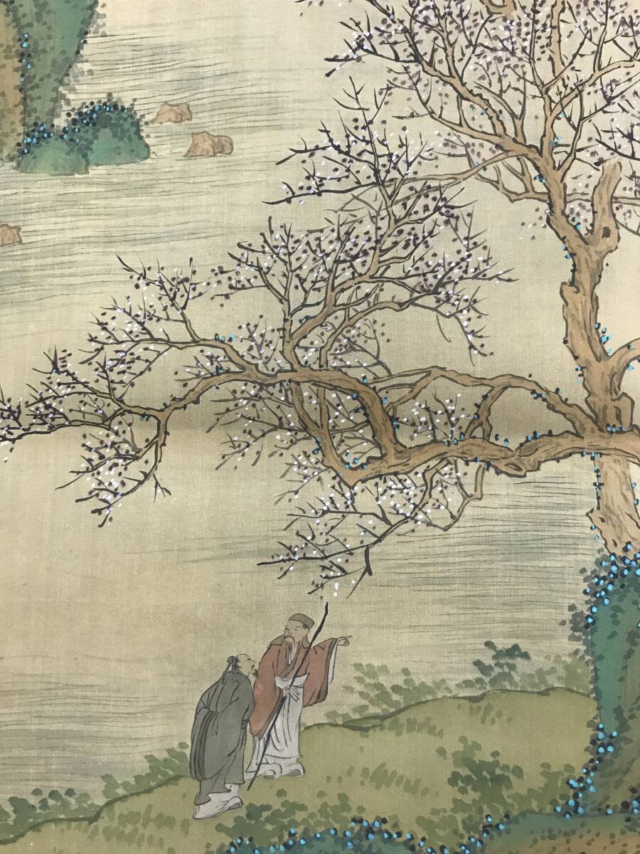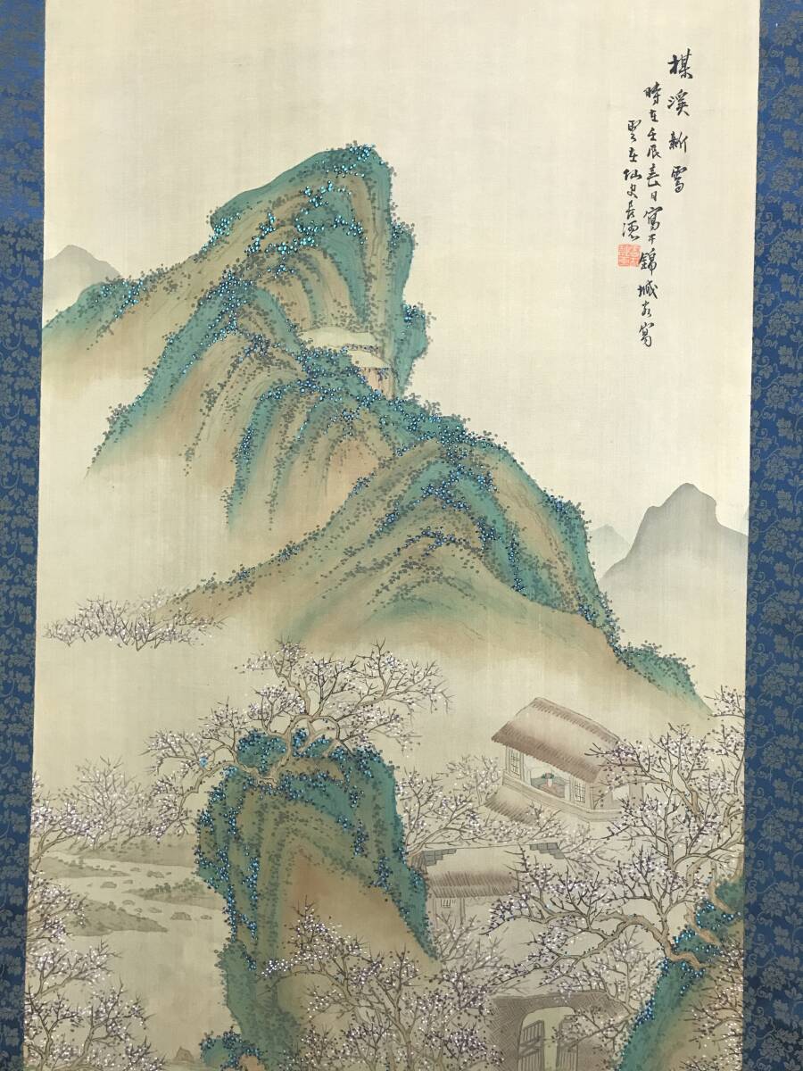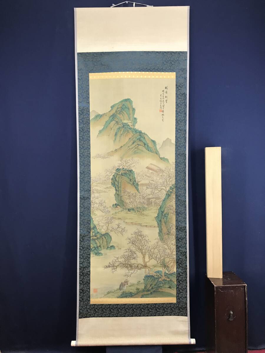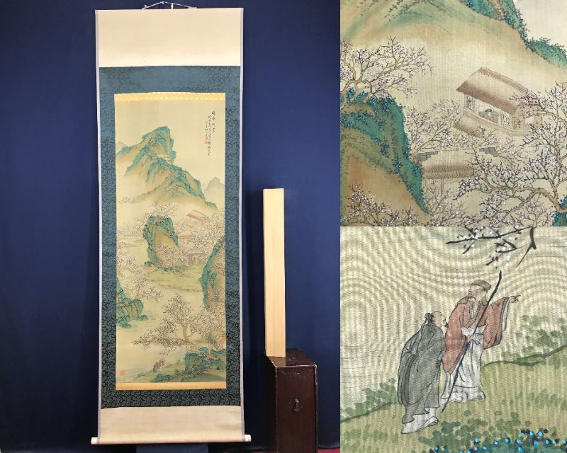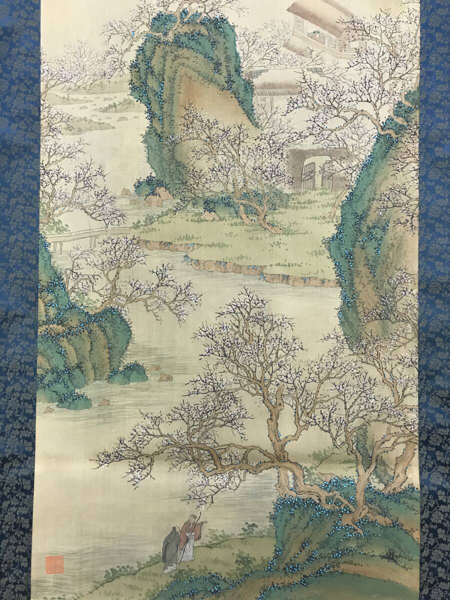 真作/長坂雲在/青緑山水人物画賛/梅花山水図/春景山水図/掛軸☆宝船☆AF-982