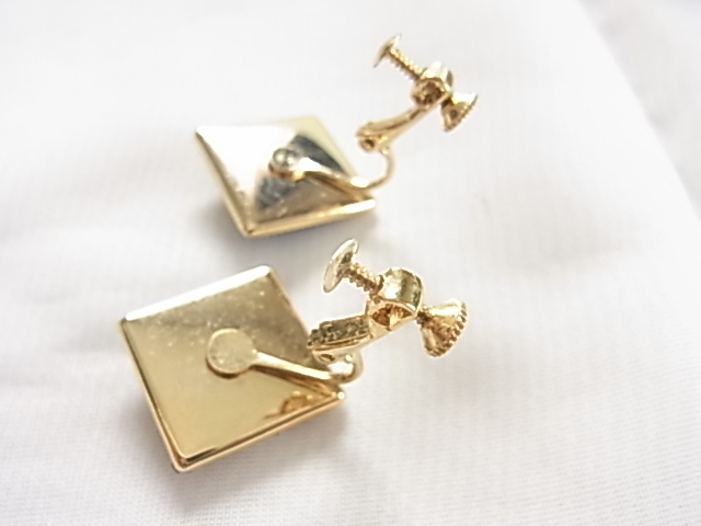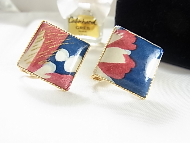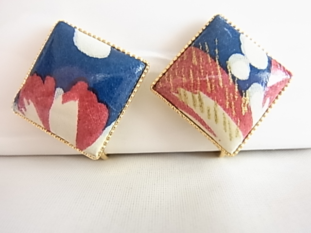 ビンテージ/ヴィンテージ 和柄の和モダンテイスト 白色ベースに富士山カラーのブルートーンと紅色の柄模様 和装にも素敵イヤリング▽