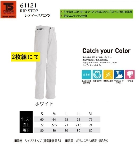ビックイナバ特価◆TSDESIGN 61121 RIP STOPレディースパンツ【05ホワイト・LLサイズ】定価1枚7480円の品が、2枚組で即決2980円