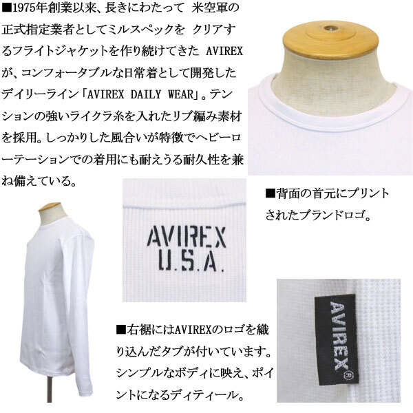 スペック | 1975年創業以来、長きにわたって 米空軍の正式指定業者としてミルスペックを クリアするフライトジャケットを作り続けてきた AVIREXが、コンフォータブルな日常着として開発した デイリーライン「AVIREX DAILY WEAR」。テンションの強いライクラ糸を入れたリブ編み素材を採用。しっかりした風合いが特徴でヘビーローテーションでの着用にも耐えうる耐久性を兼ね備えている。タイトなフィット感と、クルーネックが特徴です。 |