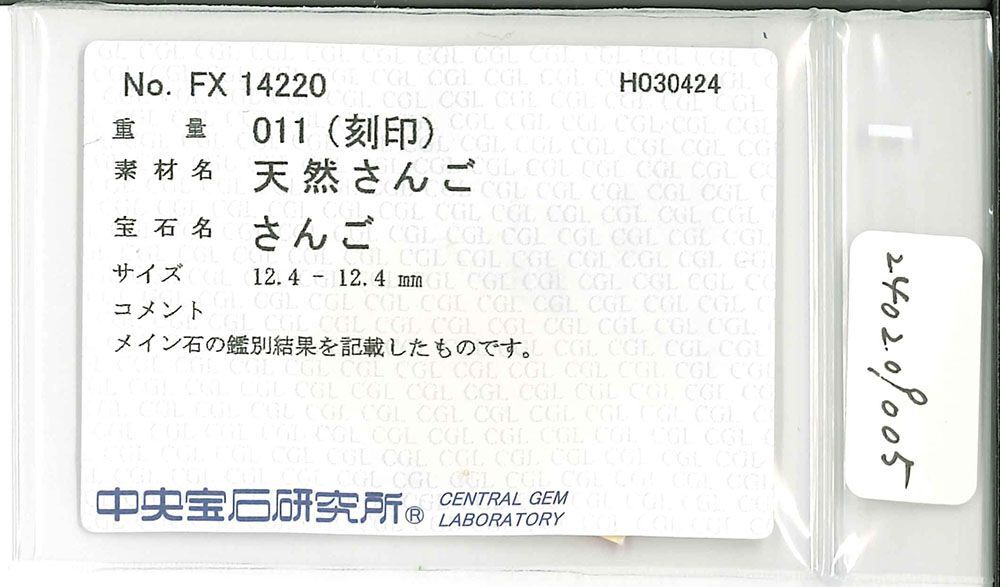 石目 | 0.11ct 刻印 (サンゴ 1石×ダイヤモンド 8石 計0.11ct) |
