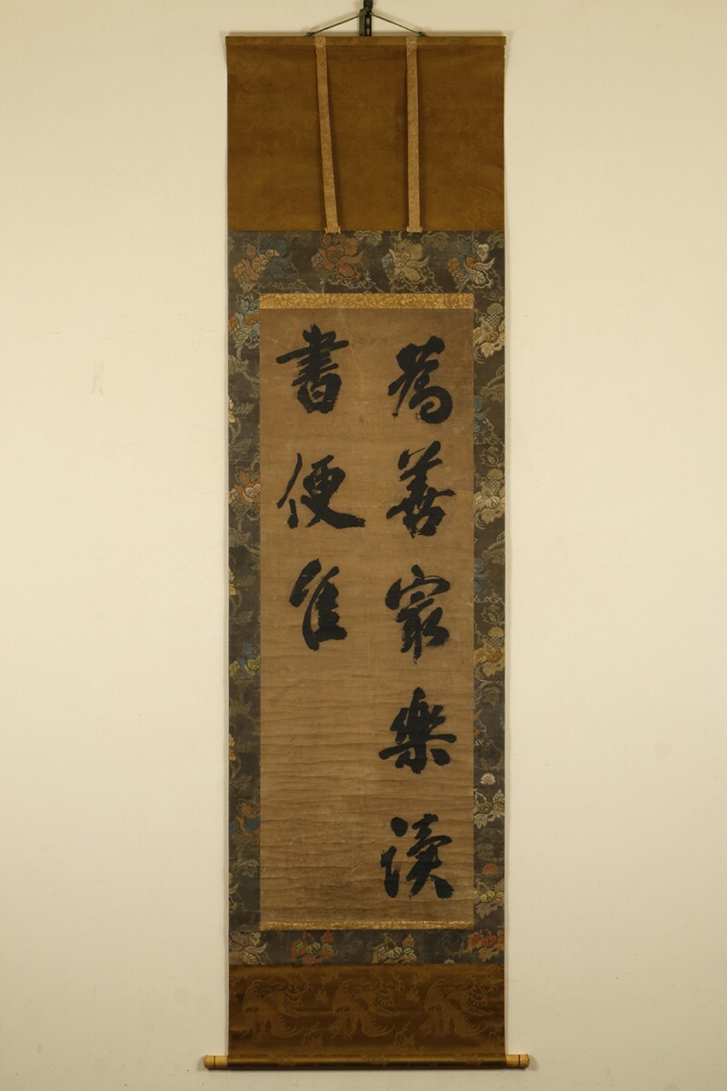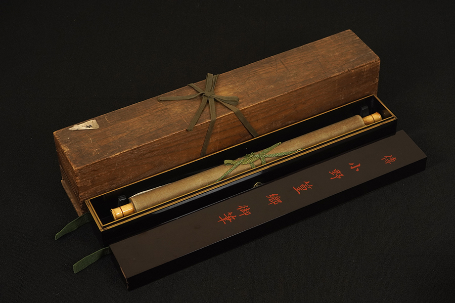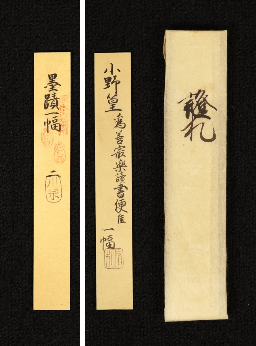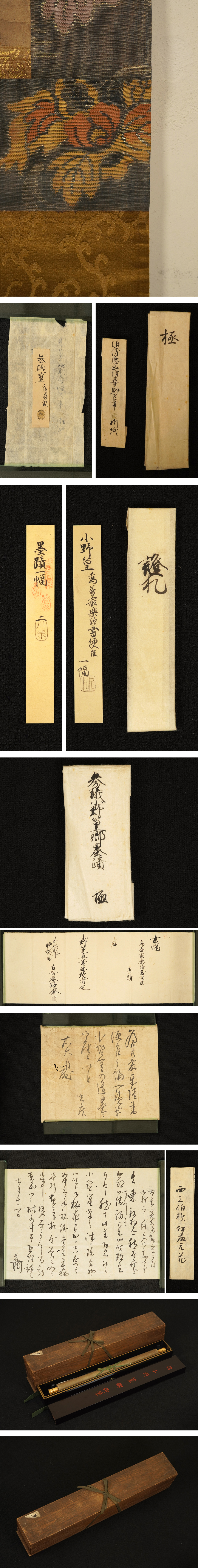 総丈サイズ…横 60 × 縦 223 cm 紙本・漆塗箱 二重箱入 近衛信尋並川勝宗久極 大倉好斎折紙 烏丸光広並伊藤東涯手紙 三条西家旧蔵 状態…ヤケ・オレ・傷ミ 【印刷ではありません】 【模写】 小野篁 平安前期の漢学者、歌人。『令義解』の編纂に携わる。遣唐副使となったが大使と争って行かず、隠岐に流罪となるが、後許されて参議となる。詩文は経国集・和漢朗詠集・扶桑集に、和歌は古今集などに収載。最終官位は参議左大弁従三位。仁寿2年(852年)歿、51歳。 近衛信尋 江戸前期の公卿。幼称は二宮。法号は応山。後陽成天皇の第四皇子、三藐院近衛信尹の養子。従一位関白。茶の湯を古田織部に学び、沢庵宗彭らと交遊があった。和歌に極めて優れ、画も能くし、書においては養父信尹の三藐院流を継承する能書家であった。実兄にあたる後水尾天皇を中心とする宮廷文化の発展に大いに貢献した。慶安2年(1649)歿、51歳。 川勝宗久 江戸時代中期の古筆鑑定家。古筆了珉門人。川勝家初代。生没年未詳。 大倉好斎 江戸後期の古筆鑑定家。京都生。大倉汲水の長男。姓は菅原、名は信古、号に古昔園。紀州徳川家に仕えた。嘉永4年(1851)法橋に叙せられる。文久2年(1863)歿、68歳。 烏丸光広 江戸前期の公卿、歌人。烏丸光宣の子。慶長11年参議となる。14年女官との遊興事件に連座して官職をうばわれたが翌々年旧に復した。のち正二位、権大納言。和歌を細川幽斎にまなんで二条派歌人として活躍。書家としても知られる。書は上代様を基礎とし、本阿弥光悦の影響を受け、全体の流れの美に重点を置く。歌集に「黄葉和歌集」。古筆の鑑識にも長けており、古筆鑑定を業とした古筆家の初代・古筆了佐は光広から古筆の鑑定も学んだ。寛永15年(1638)歿、60歳。 伊藤東涯 江戸中期の儒者。京都生。名は長胤。字は原蔵、源蔵、元蔵。号に東涯、慥々齋。諡号紹述先生。伊藤仁斎の長子。父に儒学を学び、その古義学を受継いで堀川学派を充実させた。父の遺した著書の編集・刊行に努め、さらに語学・史学・考証学・博物学などの分野にも通じて多くの門人を教えた。異母弟に同じく儒学者の伊藤介亭がいる。新井白石・荻生徂徠らと親交を深くした。著書に『制度通』『古今学変』『弁疑録』など。元文元年(1736)歿、67歳。 |