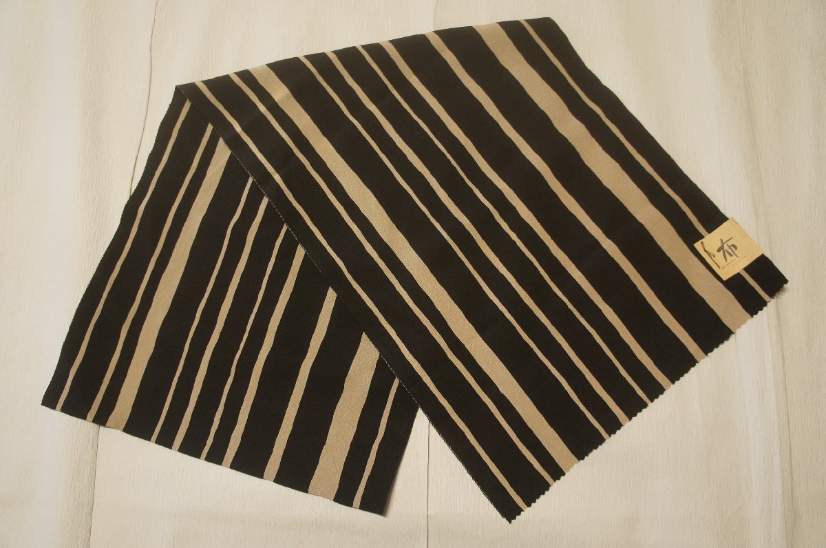 商品名正絹縮緬黒色地ベージュ色縞模様未着用帯揚[E15106]