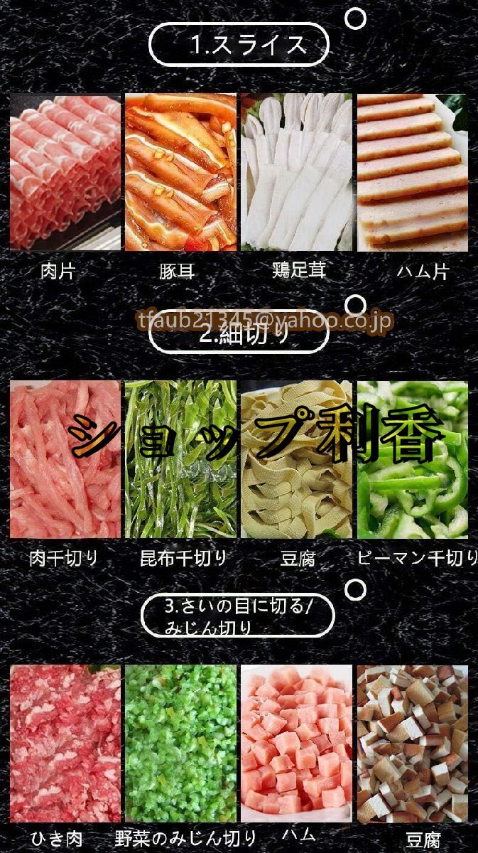 【機能】:1.スライス機能 2.細断機能 3.さいの目に切る/みじん切り 肉、魚、柔らかい野菜などに対応できます。