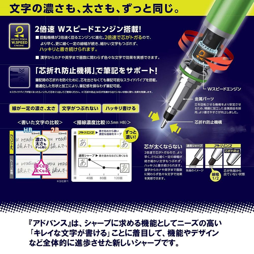 学習用途などで日常的にシャープを使用する中高生を中心に、シャープに求める機能として、文字がきれいに書けることが重要視されている。『アドバンス』は文字がキレイに書ける機構を搭載。【クルトガアドバンス】文字の濃さも、太さも、ずっと同じ。キレイな文字が書ける。