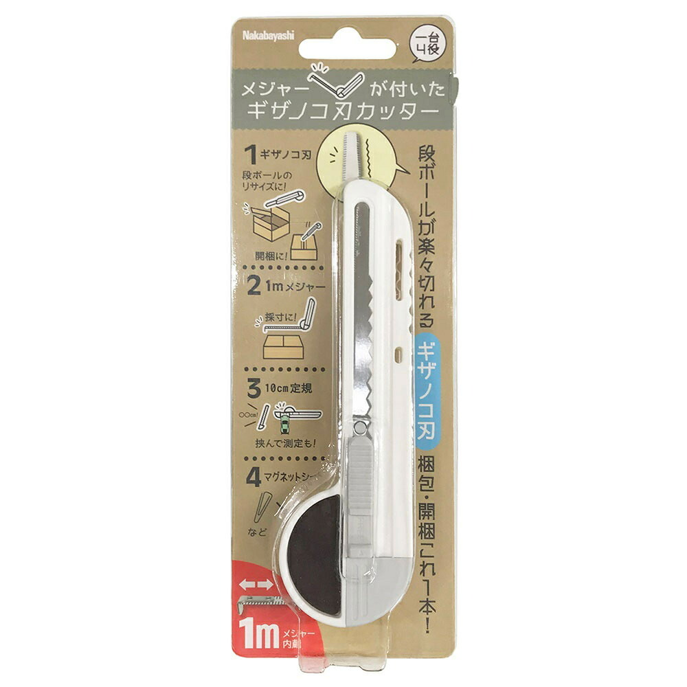 「メジャーが付いたギザノコ刃カッター」は1mメジャー、10cm定規内蔵など梱包開梱に必要な便利機能を搭載した段ボールカッターです。 ステンレス製のギザノコ刃を採用し、ノコギリの要領で刃を前後に動かして簡単に段ボールを切ることができますので段ボールのサイズ調整や加工に最適です。先端部の刃先を薄く加工しているため段ボールの開梱作業に使えます。