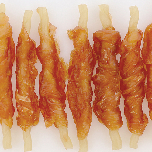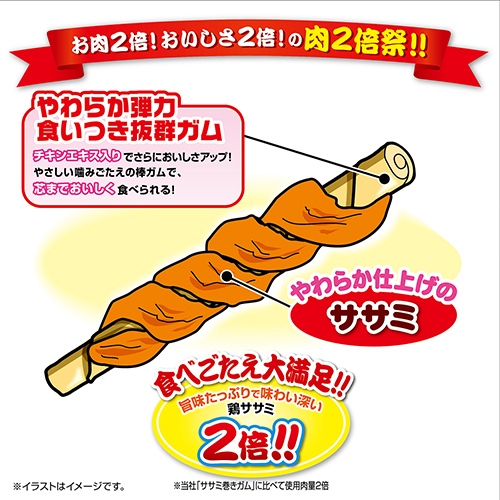 旨味たっぷりで味わい深い鶏ササミを2倍巻いた食べごたえ大満足のササミ巻きガム(ペティオ「ササミ巻きガム」比)。 鶏ササミとガムの美味しさが味わえるスナックです。 シニア犬にも食べやすいやわらか仕上げ。 保存料・着色料不使用。 農林水産省認定鳥加熱処理工場製造。