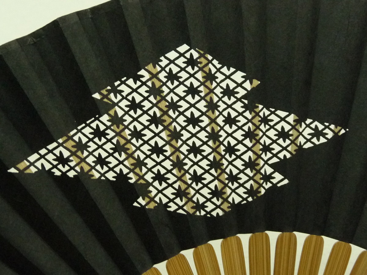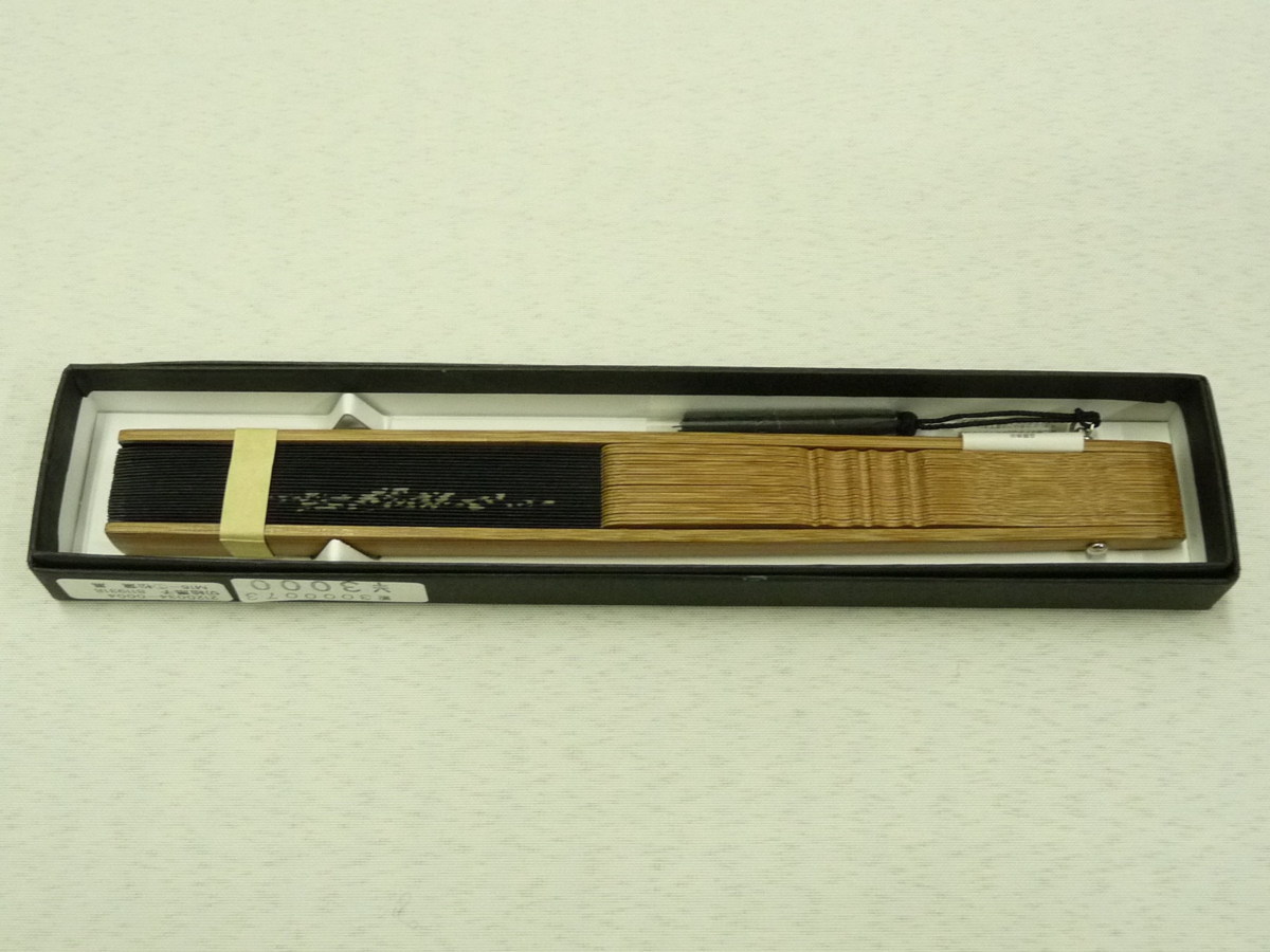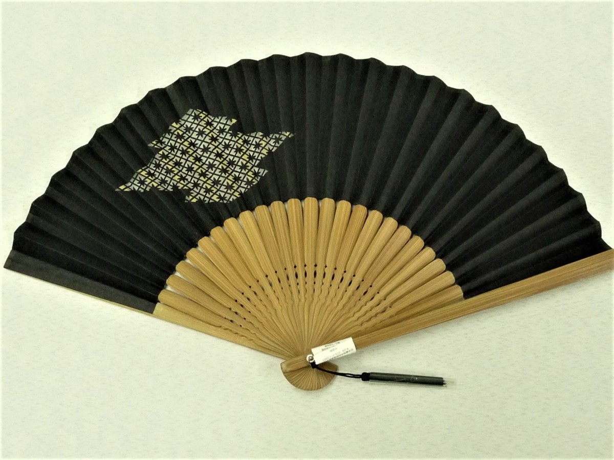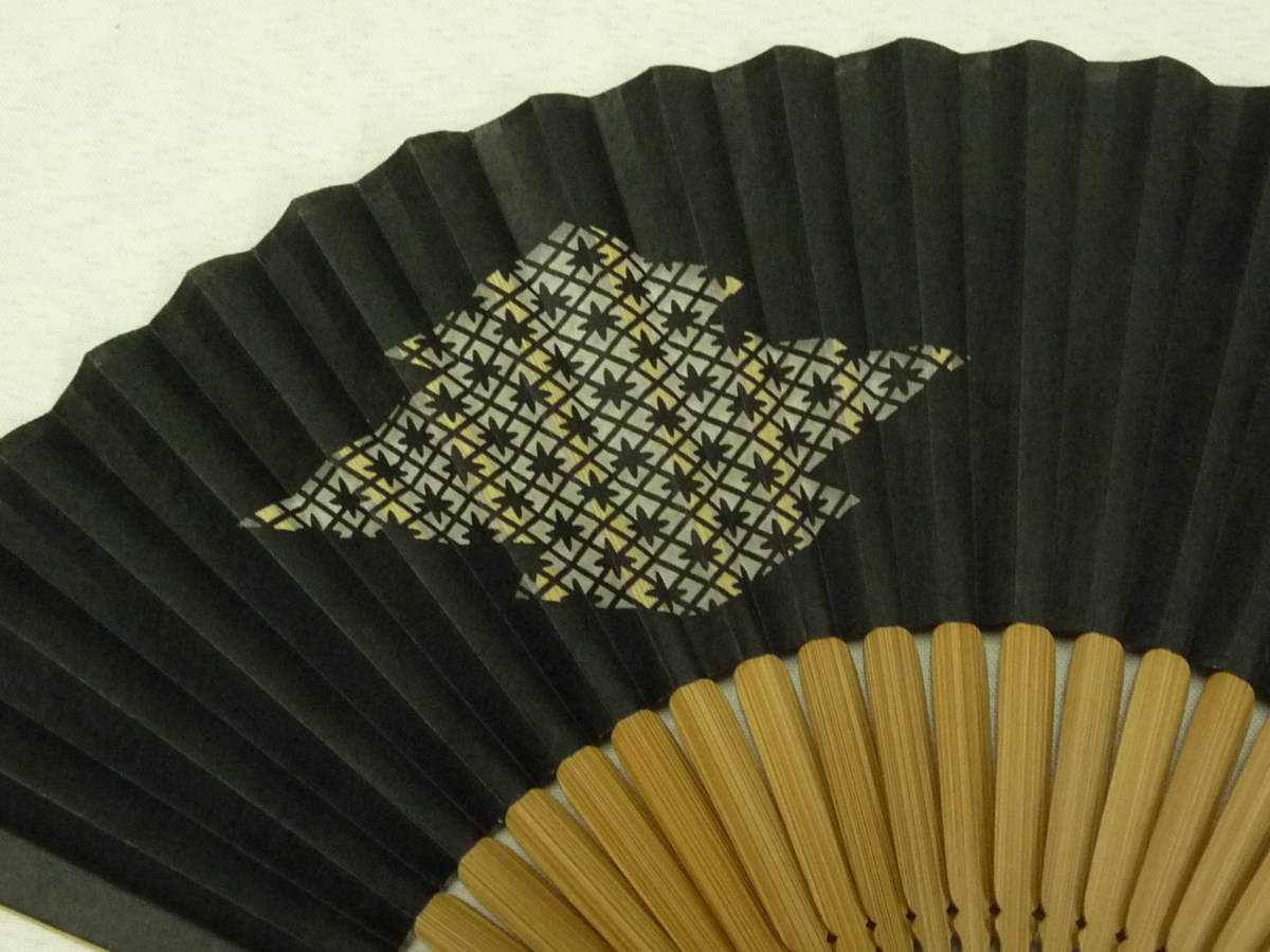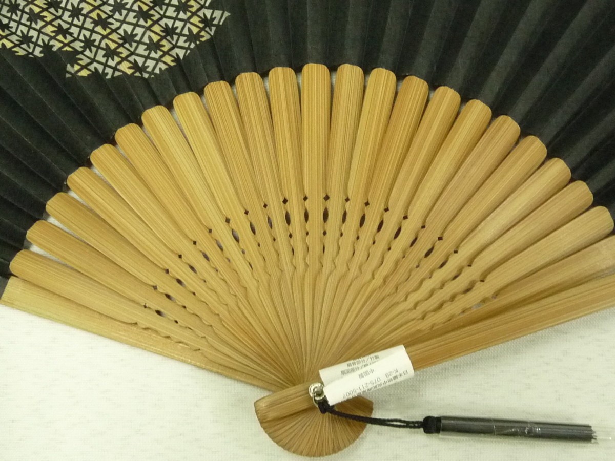 | 商品名 まゆの四季/新品/箱付き/シルク絹生地紙貼り透かし/扇骨竹製/切り絵扇子-松葉黒 | ||