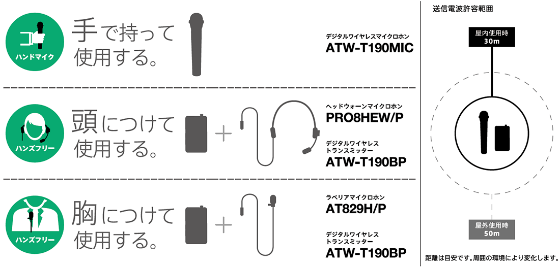 約9時間(単2形アルカリ乾電池使用時) < ワイヤレス部 > 使用周波数 1895.616~1902.528MHz 無線方式 1.9GHz DECT準拠方式 周波数特性 100~10,000Hz 受信数 1チャンネル アンテナ 内蔵アンテナ(ダイバーシティ) 通信距離 約50m(見通し時、妨害電波がない場合)