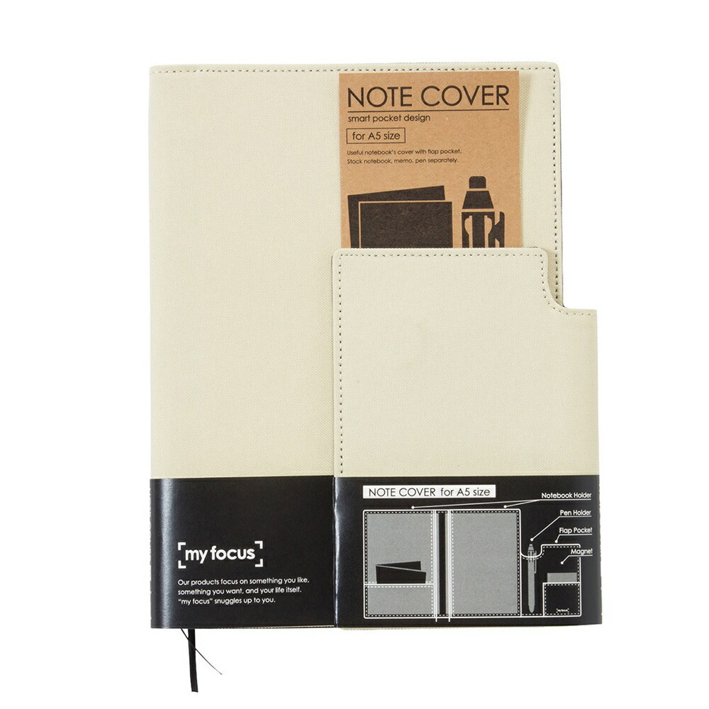 フラップポケットの付いた三つ折り構造のノートカバー。